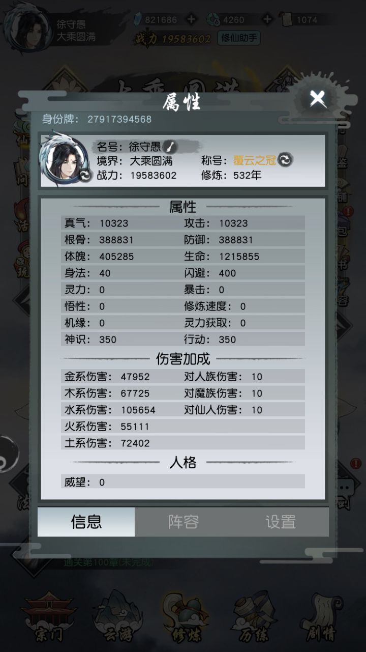 先上一下自己的状态图和仙友相关图片这是目前本人仙友状态图和人物属性修魔副本目前打到43-44这样子,说实话卡在了仙术等级上,目前来看木属性是最合适修魔副本的飞剑方面主角配暴击绝影仙友配轮回绝影不用多说暴击性价比最高仙友为什么配轮回,因为木属性以毒为主。宠物配合猴子毒,仙友毒,轮回毒,输出方面是绝对够的。因为后期每个npc的血量基本在2500-3000左右具体没算过。主角方面打修魔基本