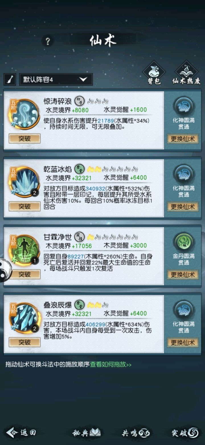 此篇献给所有水系信仰的道友们。(ps:此篇攻略仅代表个人观点,仅供参考,各位不必完全照搬照抄,不喜勿喷)此篇篇幅较长,请各位耐心观看噢。一、仙术搭配这些搭配是楼主在历练图中用的,其他诸如战场,试炼等环境可灵活调整。本次推荐搭配适用于90关以下,但相信道友经过90关的历练,应该有自己的心得,足以应付最后十关的npc了。①应对木,水系敌人(扛不住可试试换上借岳,或者借岳和土高一起用,单土高不