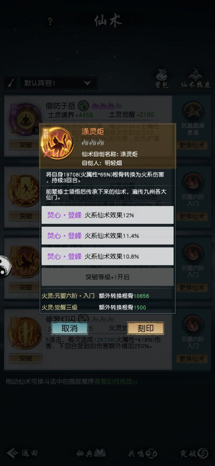 目前火系是最受欢迎的(根本没人玩其他四系),很多人都是暴力打法,两个增伤一个五连击跟复活。或者一增伤俩五连跟复活术。对于火系增伤的选择本人推荐使用涤灵炬。这个法术会使火属性数值的根骨转化成火系伤害,例如火系伤害有3w,转化火属性65%的根骨就是19500。比焕魂烧转化的多。就是以防御换攻击力,在伤害方面是最高的。以下是三种增伤的各自伤害测试技能均无刻印首先是焕魂烧的伤害这个技能是正常