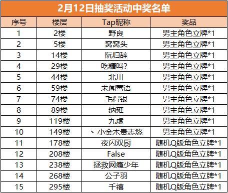 各位道友下午好哟,又到了令人激动的周四开奖时间啦ヾ(๑╹◡╹)ノ"今天玲珑要为春节期间进行的及活动进行开奖,虽然扫地僧很不舍这些周边,但如果能让大家高兴,扫地僧私藏的周边统统卷走也是不要紧的(诶?为什么扫地僧突然提起了他的铁棍|ू・ω・` )) 好了好了,话不多说,下面进入开奖环节~在盖楼活动中,帖子内共累计产生298层有效楼层,故根据原定规则,恭喜“野良”、“窝窝头”等10位道友获得男主角