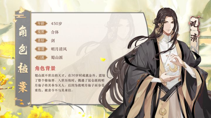 各位道友,近来,我们对风清的角色立绘进行了重置调整,使其更符合我们的剧情人物设定,不知道这样的风清大家喜不喜欢~风清作为蜀山派不世出的天才,在30岁时成就金丹,震惊了整个修仙界。但是命中注定风清有一劫,他在入世历练时,偶遇了昆仑派的明月仙子,将其奉为天人。后因救明月仙子而身受重伤,被责令不与其来往。