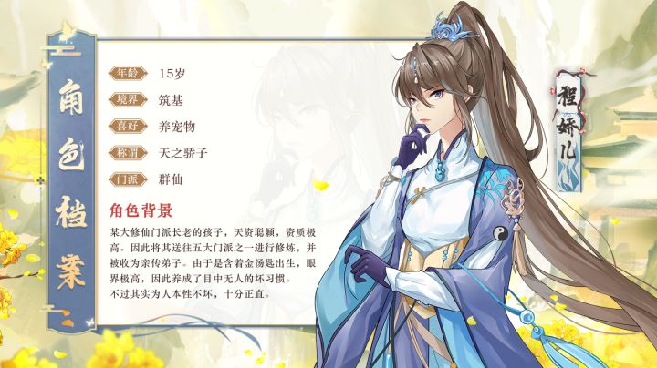 各位道友,我们的修仙界又双叒添新师妹啦!作为某大修仙门派长老的孩子,程娇儿天资聪颖,资质极高。因此其父将其送往五大门派之一进行修炼。并被掌门收为亲传弟子。由于是含着金汤匙出生,程娇儿眼界极高,因此养成了目中无人的坏习惯。不过程娇儿其实为人本性不坏,十分正直。 修仙界轶事一:程娇儿刚出生时由于资质极高,几乎立刻受到门内上下所有的人的宠爱。修仙界轶事二:随着年龄的增长程娇儿也变的愈发美丽,听说追