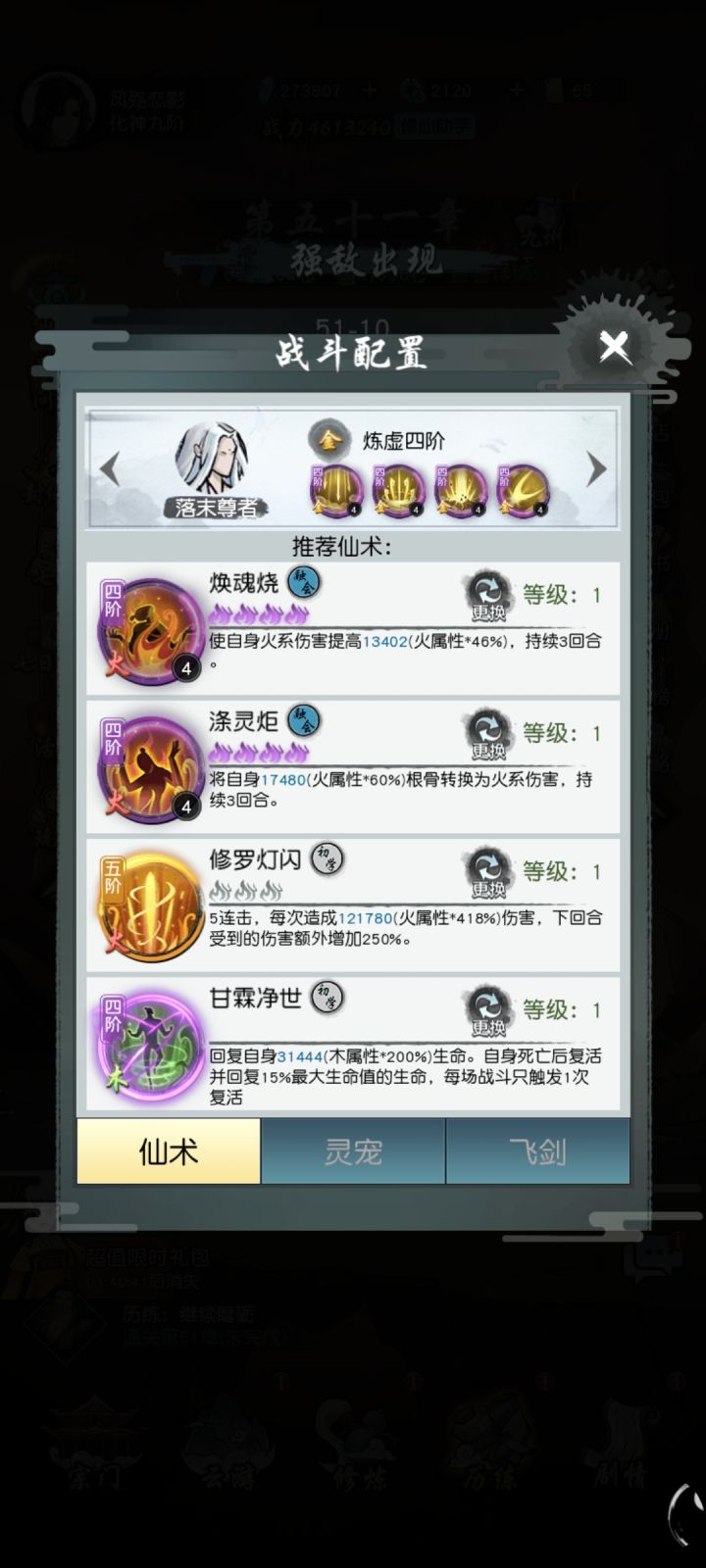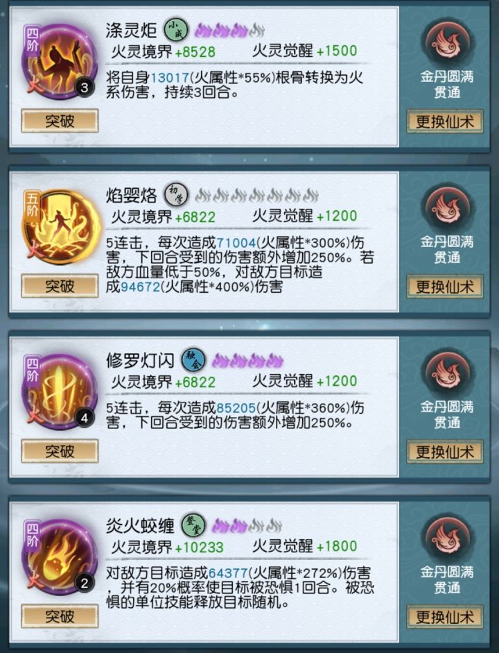氪了288。今天升了合体,大提升的一天。我是玩火系的,火系核心是修罗,必须搭配buff仙术使用。从建号起无脑培养这个,婴烙随缘,每210抽会有一个高级紫保底好像。buff技能焕魂烧,涤灵炬也要慢慢搞,应对不同情况,比如你用涤灵炬在第二回合直接被秒时就该尝试着去用焕魂烧。其他系技能随缘就行。微氪不要拿绑玉抽宠物,会变得不幸。多少氪佬都因为这个毁号。随缘抽就行,前中期飞剑优于宠物,当然火老虎除外。