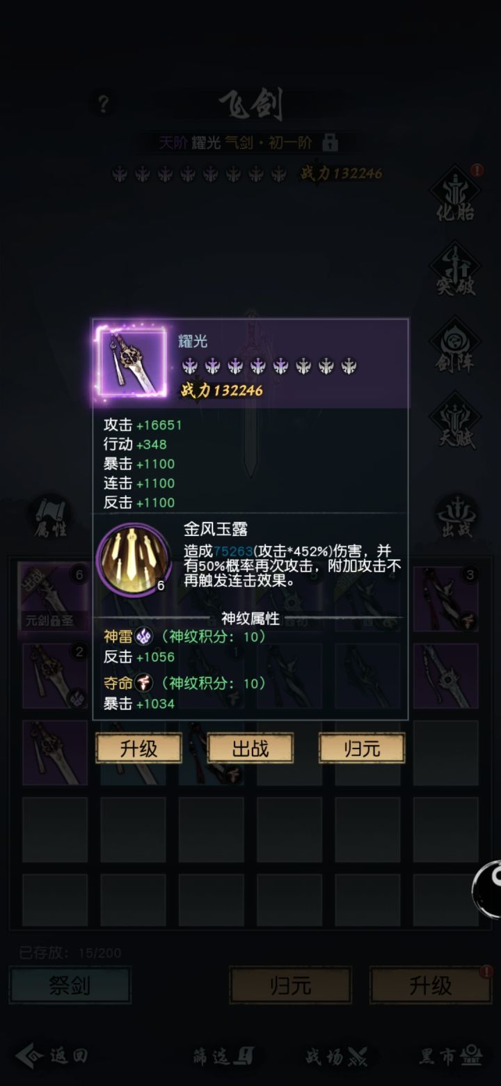 写一篇飞剑攻略 当然是个人心得 欢迎讨论首先飞剑有三种神纹 暴击 连击 反击1.金系耀光可以看到 金系耀光灵根有额外连击加成 而且技能自带连击 合起来的概率是70%(我不知道灵根是否累加 姑且当他累加) 70%概率是很高的 对于能多次打的副本来说相当于100% 其他就是了 如果加上连击神纹 虽然说连击概率达到了90% 说实话输出达不到最大化理由如下1.对于打副本 我们可以多次打 70%和