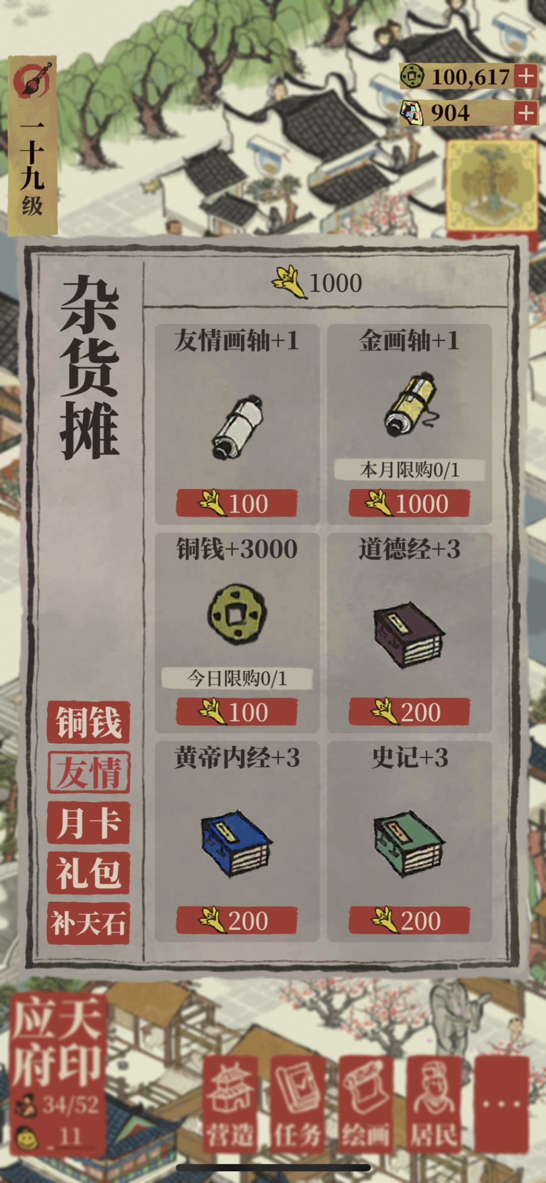 好友系统其实是很大的福利机制(很容易被忽略,从好友处可获得: (1)友情点(友情商店) (2)土行孙(金装、金画轴、补天石、经验书、铜钱等) 【友情商店】 🌟可兑换物品 每月限购(1次):金画轴(必买) 每日限购(1次):3000铜钱(必买) 无限兑换:友情画轴、经验书 🌟Tips 1. 加满50位好友后,每天稳定获得300-500的友情点(每位10点) 2. 每天可换3000铜钱(100友情点即