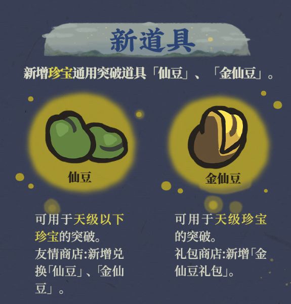 金仙豆先突破哪些珍宝?一张图告诉专属珍宝的优先级! 1.5.1版本将新增道具——仙豆,金仙豆 金仙豆可用于突破天级珍宝,也就是说,满级专属再也不是梦想了! 那么,优先突破哪些专属珍宝呢?如下图所示: 有争议的应该会有 李白的专属,探险属性提升10%。探索新区域时,立即完成20%的进度。有仇珠和徐霞客珠玉在前,略显微小。 文俶的专属,建造属性提升10%,农牧属性提升10%。一件珍宝顶两个使用。 其他