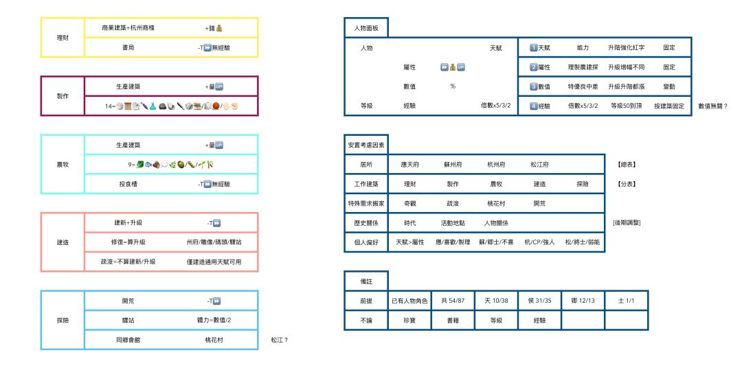 继之后,就是人物汇总了,是的,抛弃了珍宝🤪 风格还是极简emoji,第一次开了坏头好像改不太过来🤣 图表分三步,共10张图。(看图更直接,文字是解说) 第一步,[分析要素]+[人物面板参照]。列明人物面板和五种属性(理财/制作/农牧/建造/探险)的功效,以及个人安置居所的考虑因素。 第二步,[客观分表]×5+[主观分表]。按照五种属性分类已有特殊居民的天赋,天赋细分为通用天赋/时间限制/建筑限制