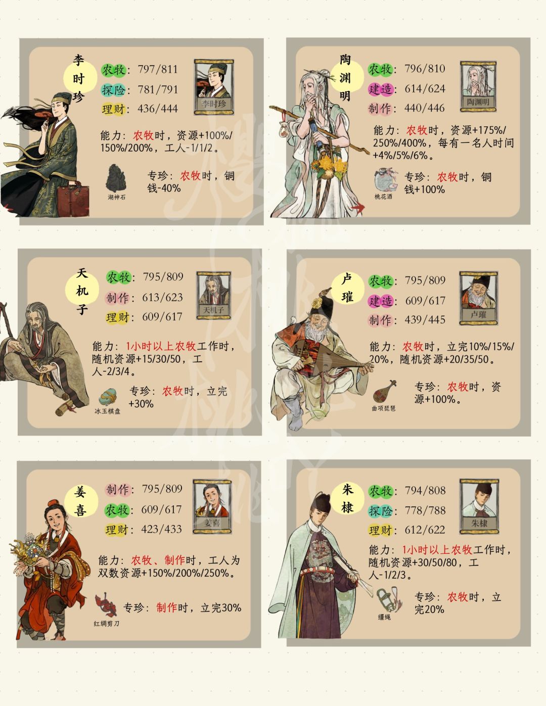 🎲|分类:生产专属、投色槽、加产、减时间、立完率、物品掉落率、加随机资源、减人、加菜肴、加铜钱、加属性数值 ❌|一些全能人物会另归类 具体见农牧小卡 🤔|客观推荐主 自己什么阶段挑选适合的人用就可以 了 #江南百景图攻略 #江南百景图 #江南百景图人物