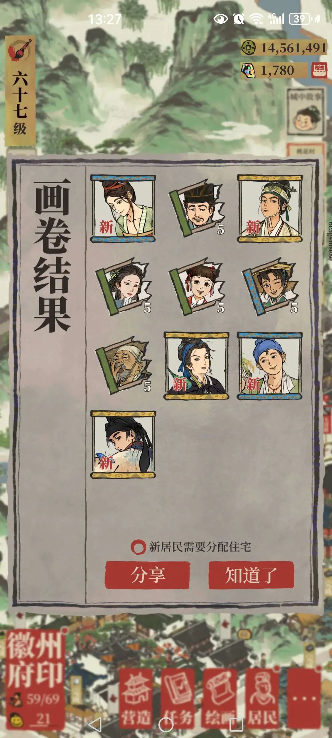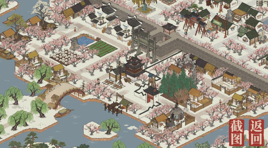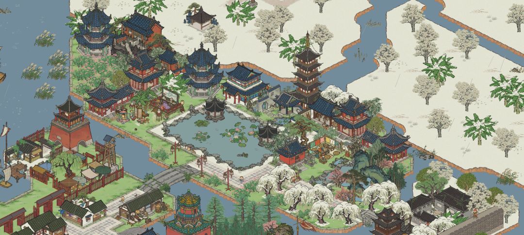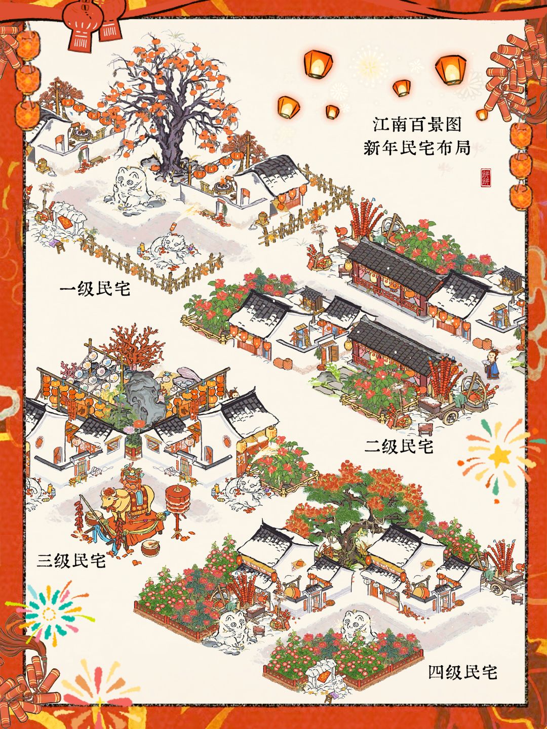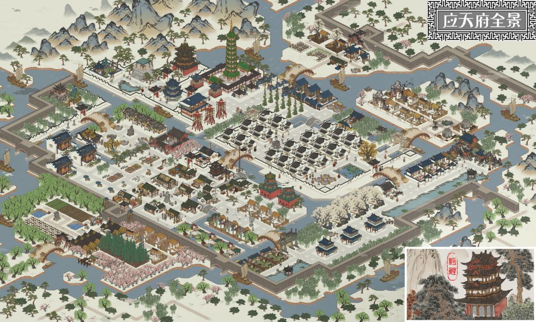 应天府全景镇楼(右下角有缺我懒得补了,弄个图挡下 应天作为开局大本营只有三个加成收入的石像,各种布局也很多,不过要佛系的话只有财神雕像,可以16个布匹店或者16个成衣店,成衣店需要的工人多单人利润低不过总收益更高。 所以这里完全看你自己的情况来安排,忍受不了慢速度的就肝画室(和水井;不想肝且要升五级民宅工人多的完全可以用成衣店,工人少就布匹店。 同时,五级民宅的挂机收益是很可观的,假设应天和苏州共