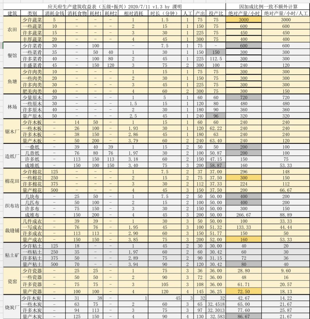 ⭐更新1.4⭐ 新增 木炭场 木炭店数据,以及苏州部分数据 移除 特殊居民标记(特殊居民需求随着州府等级改变) ⭐历史记录⭐ 更新1.3 新增 瓷器店数据,苏州数据和挂机挣钱指南 更新1.2 新增瓦片店三四级数据,瓷窑数据 PS 我画院又忘记改了,经济表第三项是画院 通知1.2 经济表第三项是画院,下次更新会改 更新1.1 修复成衣店计算错误 ⭐读表须知⭐ 均为五级数据,四级时间请翻倍 生