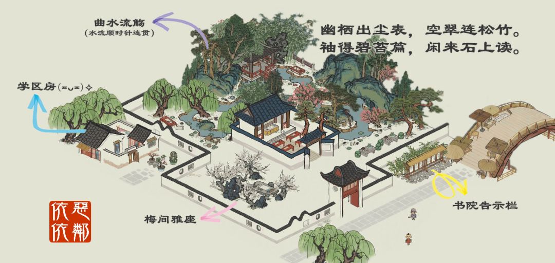 今日份高产晒村,上午的闺蜜二进小院布局戳→ 曲水流觞主题的书院想很久了!!!原本就是文人墨客诗酒唱酬之雅事,和书院很搭有木有!今天中午终于44级,立马看了8个广告把曲水流觞的最后一个部件肝出来了 布局TIPS: 没有太多好讲解的,曲水流觞抠掉一个(带桥的),利用书院本体挡住衔接处,水流依然成顺时针连贯,满足强迫症另外就是留白!留白!留白!梅间雅座周围和书院本体门前留了大量空白格,以创造空间感和幽静