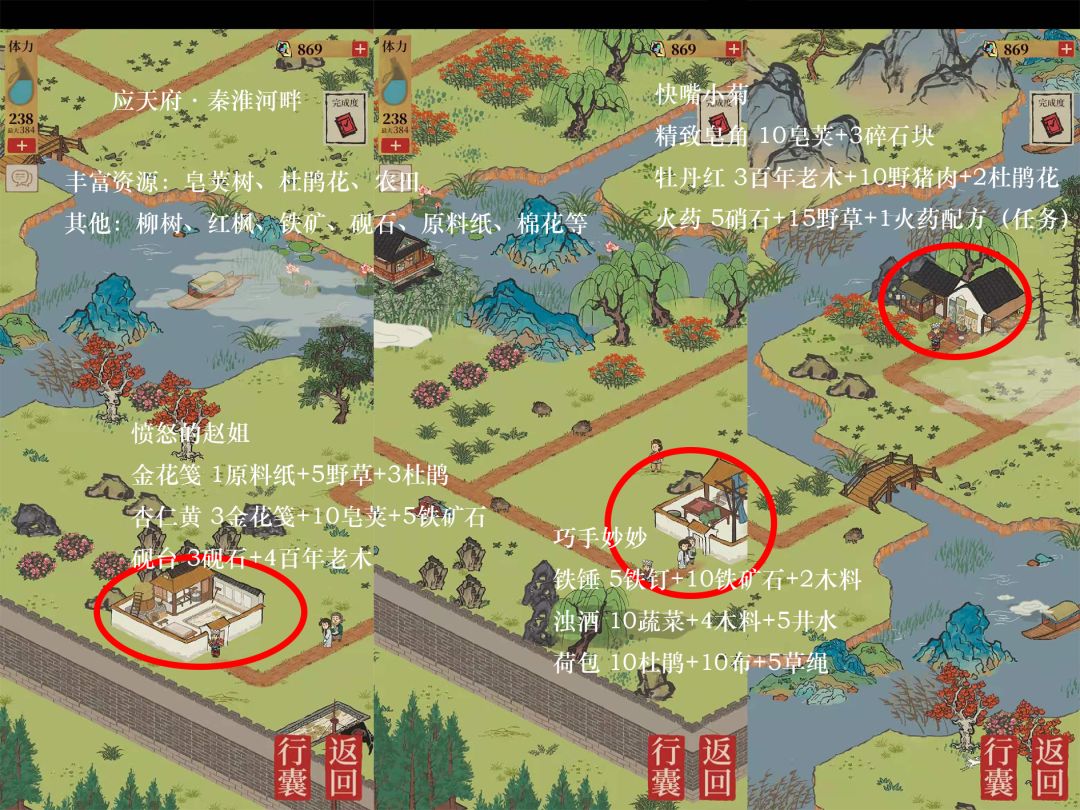 采集物资: [碎石块]、[皂荚]、[百年老木]、[野草]、[杜鹃花]、[水稻]、[草绳]、[枫叶]、[铁矿石]、[铁钉]、[百合花]、[牡丹花]、[松果]、[硝石]、[竹叶]、[天然棉]、[木料]、[枯枝]、[野猪肉]、[河虾] 商店兑换: [饭馆]兑换——[肉包子]、[青菜豆腐汤]、[冬瓜虾仁汤] [画室]兑换——[松烟墨]、[牡丹红]、[飞泉绿] 其他地图: 秦淮河畔: https://www