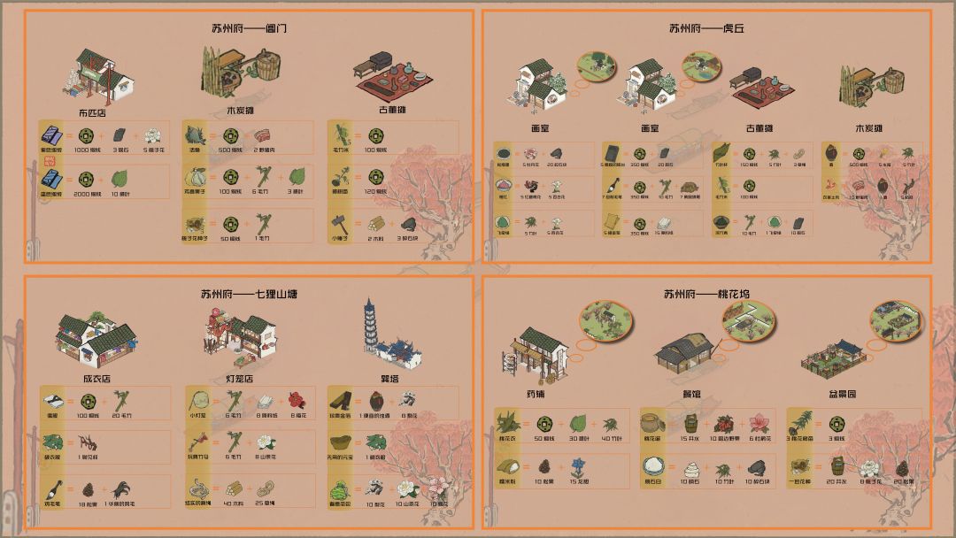 苏州府城郊探险有四个地图:阊(chang)门、七狸山塘、虎丘、桃花坞 探险资源比应天府多很多 本篇总结了探险资源的获取建筑,获取方式已经需要材料的数量 桃花村探险、土地公公兑换所需材料都可按图索骥找到 苏州府完结,撒花 接下来会弄杭州府的,预计下周末可以弄出来