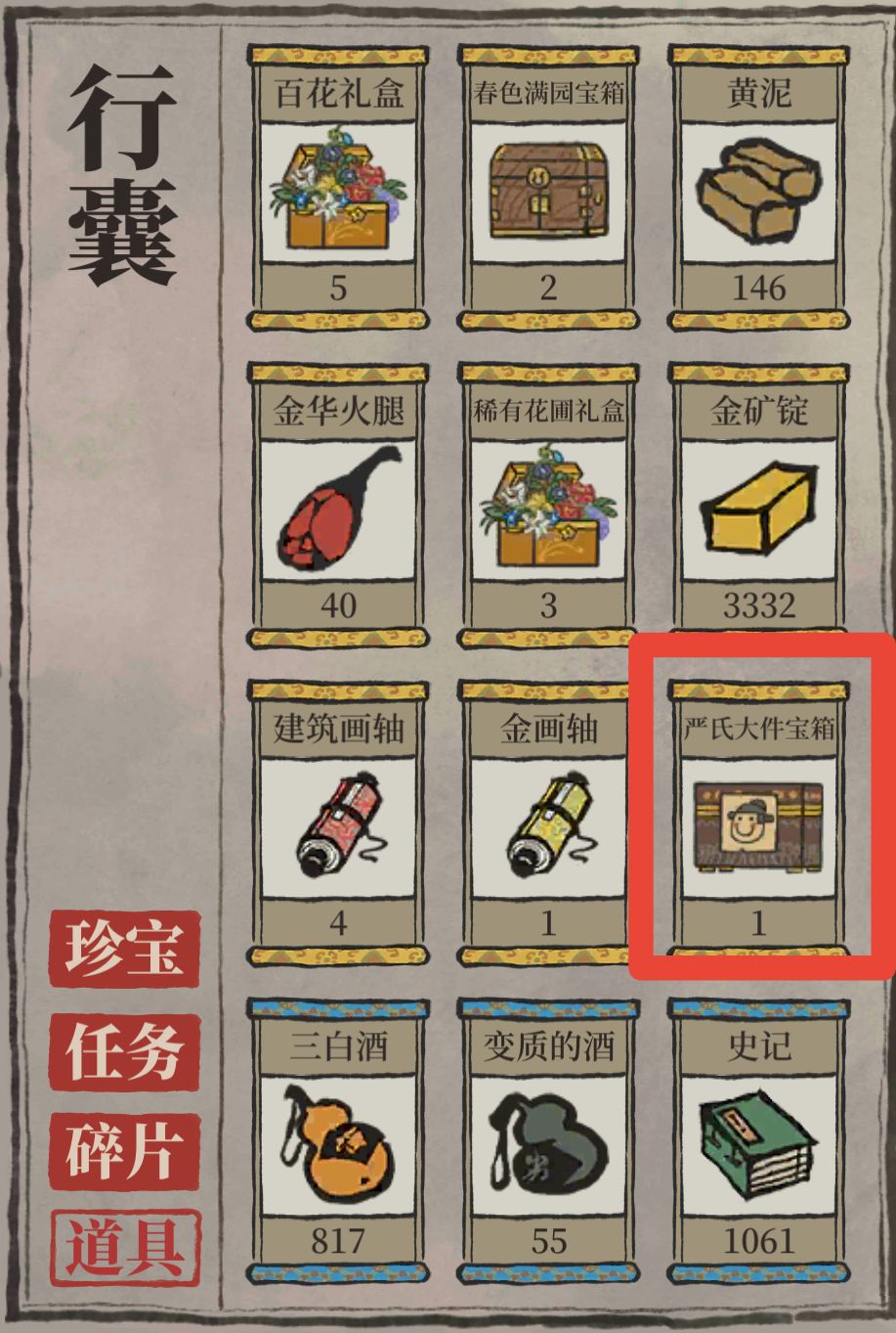 ①严大人老四件套✔,放在以前全是价值150(不是指rmb)的大件。 目前日常严大人处已下架,但仍有获取方式,获取方式为桃花村严大人处火腿兑换。 如果有喜欢的可以选。 ②竹间雅座✖,一格的小建筑,不晓得为啥进了这个宝箱。 同样的,目前日常严大人处已下架,但仍可获取,获取方式为苏州限定盗贼义贼处概率获得,但概率实在是不太高。 不建议选,太小了。 ③梅园&茶艺雅座✖,价值同样是150,但并不稀有。 日常