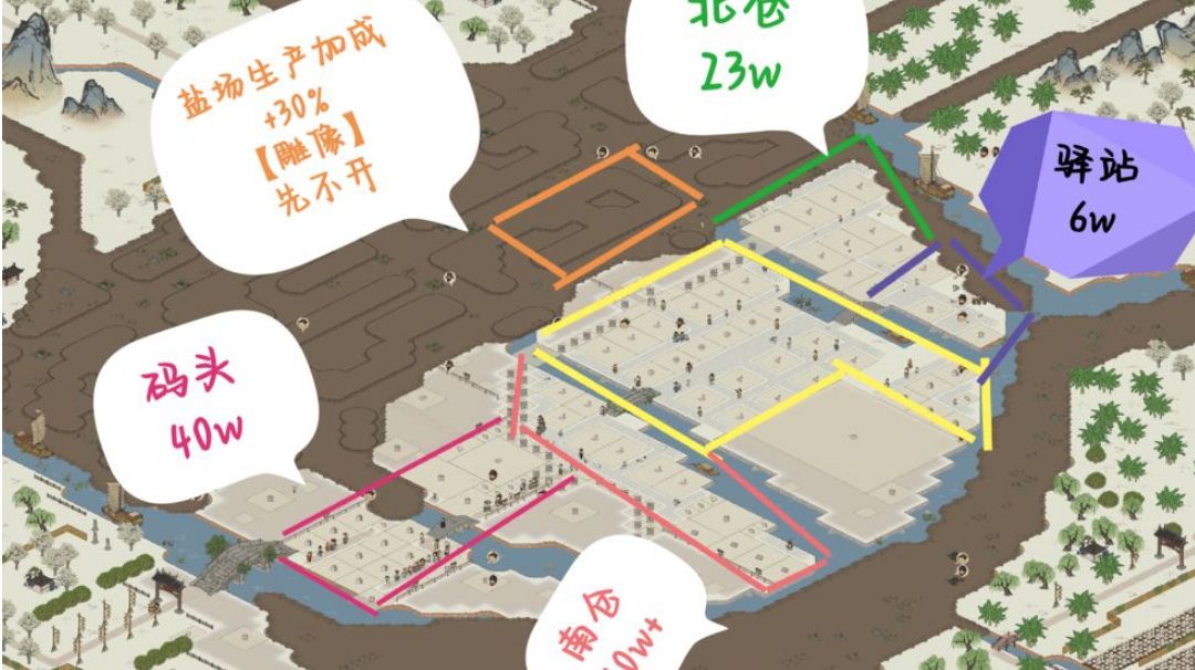 本攻略适用范围:同攻略一二三。 目录: 【第一部分】 a.松江介绍 b.开地&盐场生产加成的布局 【第二部分】 a.采灵画舫 b.松江限定活动: 倭寇入侵、仓库着火、抓倭寇 【第三部分】 a.介绍盐商&【徽州府】解锁条件 b.如何升级盐商 c.永不破产的盐商 【第四部分】 a.开荒过程 b.人员安排 c.生产建筑数目 【第一部分】 A.介绍: 第四城【松江府】,是江百里出了名的地图小,生产少的州府
