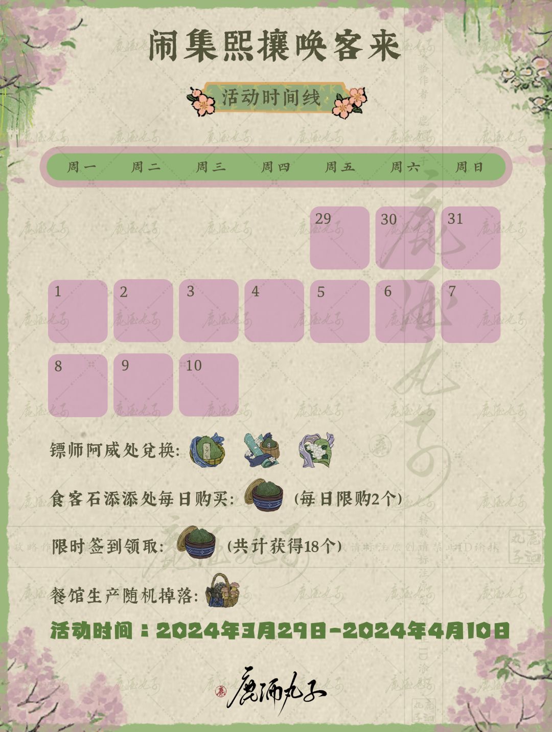 🌿图1-活动时间线 🌸活动时间:2024年3月29日11:00-4月10日23:59 ⭐镖师威威处兑换:古树茶叶、高山白花、布帛杂货 ⭐食客石添添处每日购买[上好茶叶](每日限购2个) ⭐限时签到领取[上好茶叶](共计获得18个) ⭐活动期间内记得修复限定建筑,否则活动结束后无法获得修复材料 🌿图2-领取建筑 🌸前往[州府]-[公告]-[活动]-[居民兑换]-[镖师阿威]处领取待修复的[四方货集]