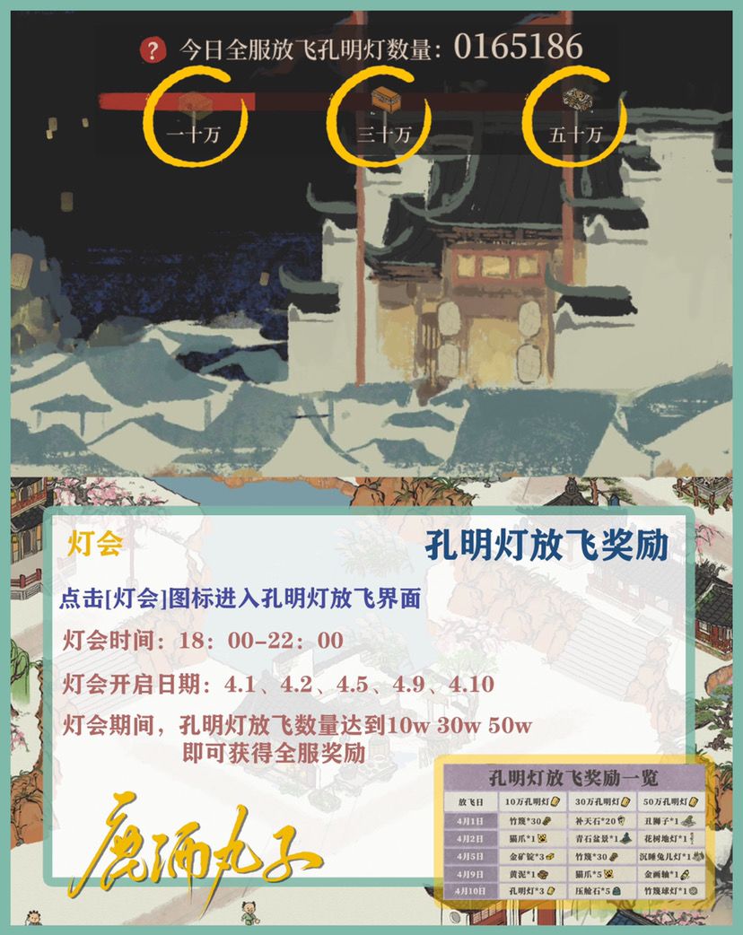 灯会每日刷新每日孔明灯放飞次数达十万、三十万、五十万均有奖励 灯会开启时间:18:00结束时间22:00 灯会日期:4.1、4.2、4.5、4.9、4.10 [孔明灯]获取: 1-每日任务获得 2-[青团铺子]兑换获得[孔明灯] [青团铺子]放置问题: 知府们可以随意放置在任意地图,任务不受地图影响,跨地图也可以完成 [青团铺子]任务 任务日期:4.1-4.10 共计10天 每天约可获得200竹篾