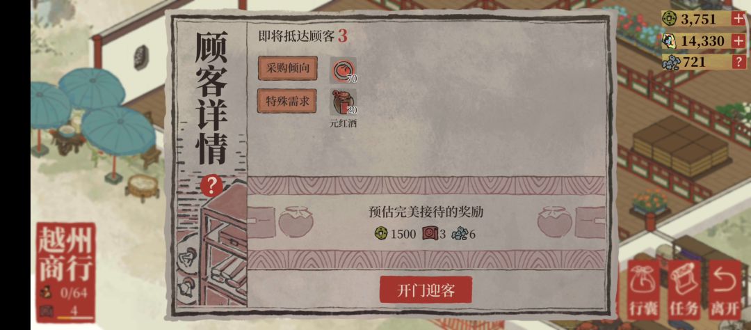 主帖最后更新了二楼全区的货架布局图。 二楼新增了帽子和服饰货架,加上之前的饰品和鞋子货架,一共也是可以摆放四种货架。 二楼第一次扩地就需要35个巧匠锯,惊不惊喜(⌒▽⌒) 不得不说这礼服的产量真是低到吐血(⌒▽⌒)而且工人数量是单数,导致姜喜的技能加成也无效凸^-^凸。只能靠桥梁的区域加成了。 二楼刚开始的散客人数也不多,四五个人,每个人提供6点口碑和2点碎银。 二楼接待的第1个富商…就不能给点补
