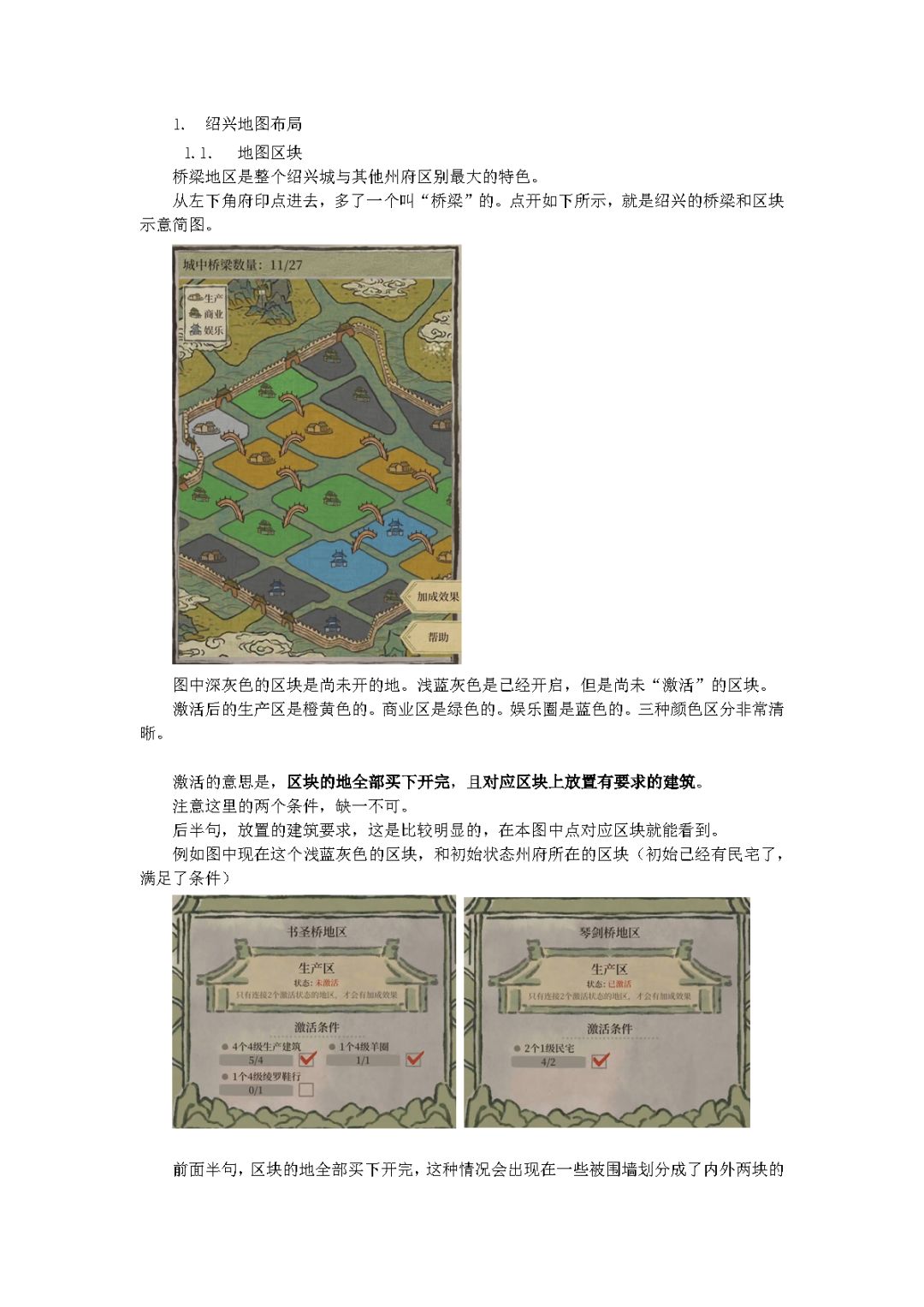 id:m8lzxyyay75 目录 1. 绍兴地图布局 1.1. 地图区块 1.2. 桥梁的连接和数量 1.3. 桥梁的拆除 1.4. 加成效果 2. 越州商行 2.1. 柜台的布局 2.2. 货架的种类 2.3. 客人的需求 2.4. 结合客人需求调整柜台和上货(实操练习版) 2.5. 好评与升级,店面的扩张 word写出来,粘过来总觉得格式不太对——索性转pdf然后上图,一页页贴算了。