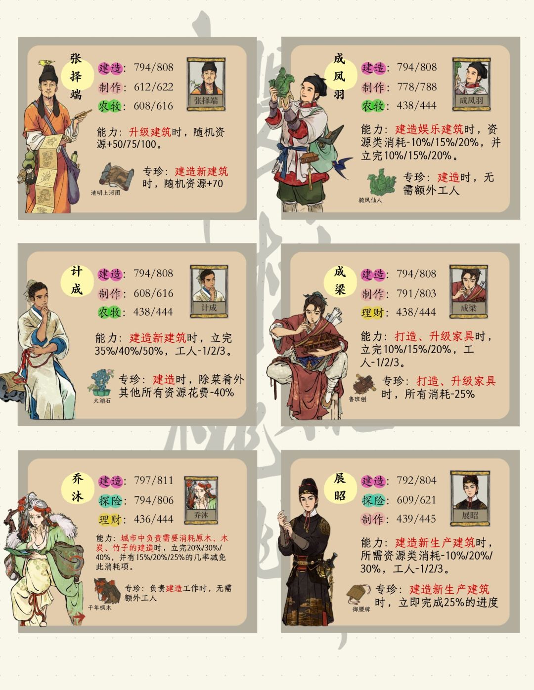 经历了前中期的开荒,自己梳理了一下搬运过来的人物以及适用的项目,来分享一下。 人物及专珍主要按自己已有的和已升级的等阶来的,大家可以参考一下思路,具体按照自己的实际情况调整。 建造: 【第一阶段】(7人) 建民宅、娱乐建筑时,省时、减人是重中之重,这时候可以减2~3个工人的弥月和罗贯中就显得非常有用了,文徵明新建减时、杨宗保带专珍升级减时也很棒棒; 开始建造生产和商业建筑、包括桥梁时,需要使用到新
