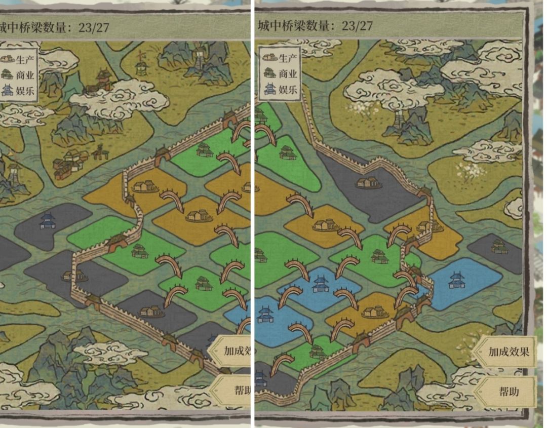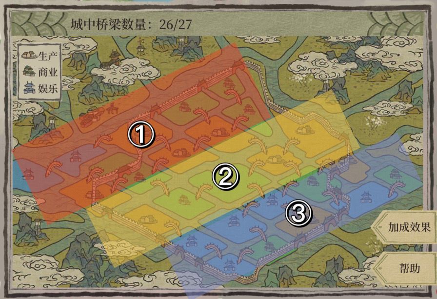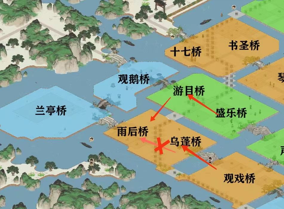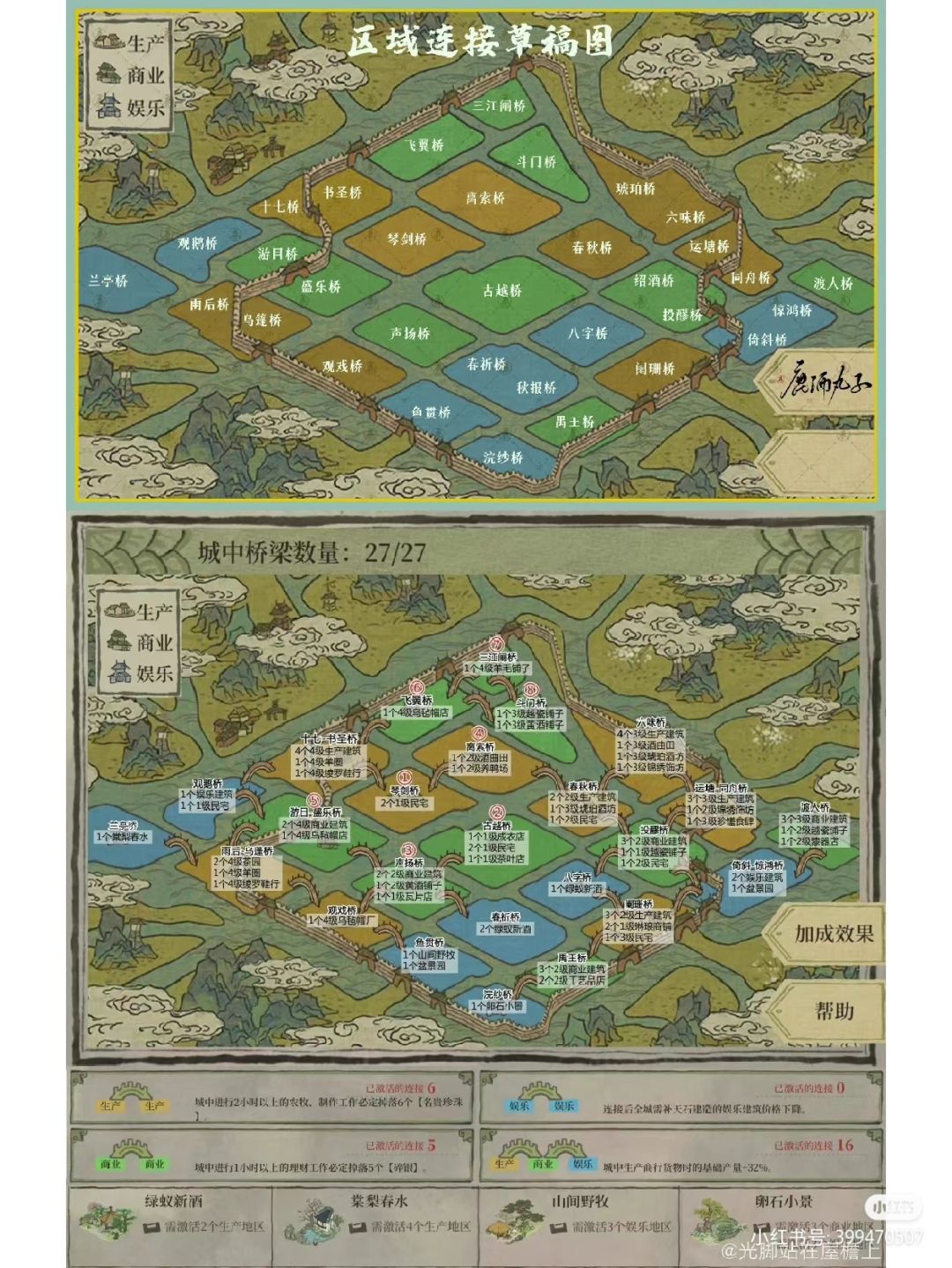 本帖为4.4.2版本绍兴府桥梁连接参考攻略 绍兴府相关过往讲解可以参考主页相关攻略帖。 观前提醒: 1. 攻略具有时效性,参考前请确认当前攻略是否适配当前版本。 2. 4.4.0版本更新后“乌篷桥-雨报桥”被分属为两个独立区域计算桥梁连接,故而需要连接盛乐桥或观戏桥其中之一后方可拆除原有桥梁。 3. 桥梁连接并不存在所谓“最优解”,但各项加成之和存在确定的最大值:这个值为41。若城市四项加成效果之