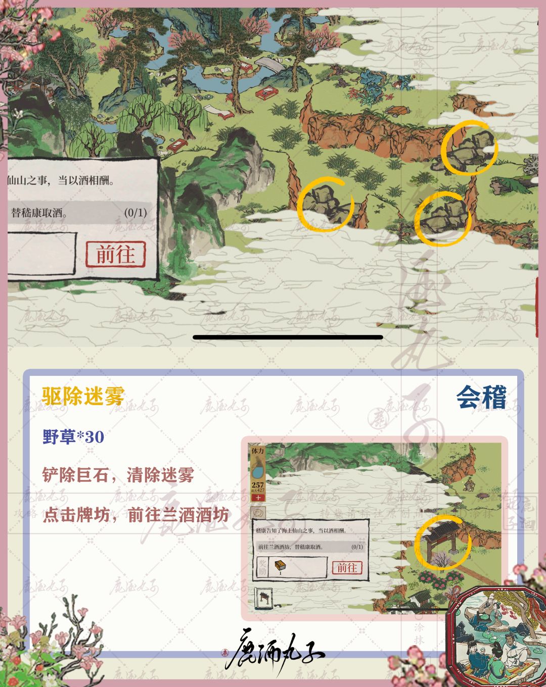 主线剧情&彩蛋&宝箱钥匙&探险全景图 ⭐️主线剧情——图1-图12 ⭐️彩蛋——图13 ⭐️宝箱&钥匙——图14-图15 ⭐️探险全景图——图16-图18 ⭐️主线剧情 🌿图1-驱除迷雾 🌸铲除巨石,清除迷雾 🌸点击牌坊,前往兰酒酒坊 🌿图2-竹雕酒 🌸推开挡门的酒坛 🌸点击最里面的酒坛,找到目标酒 🌿图3-拾级而上 🌸铲除沿途的巨石 🌿图4-跟上常不老 🌸铲除迷雾前的巨石 🌿图5~图7-树立告示