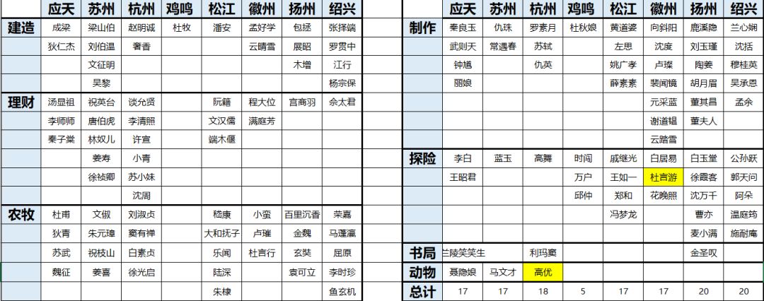 开头一图。 论坛内似乎已经很久没有角色分配的攻略贴了,在更新了许多角色和城市的情况下,个人将目前已有的基本全角色做了重新分配(不包括限定角色和几个氪金角色),并作简要的分析,尽可能地考虑到了每个角色地技能优先级,人物关系,历史人物的居住地,各个城市的均衡发展,希望能够帮助到大家。 下面开始逐城分析。 一、应天 应天功能多样,桃花村,宅邸,雅集捐赠,到后期基本算是除扬州外最忙的地方了,因此应天府分配