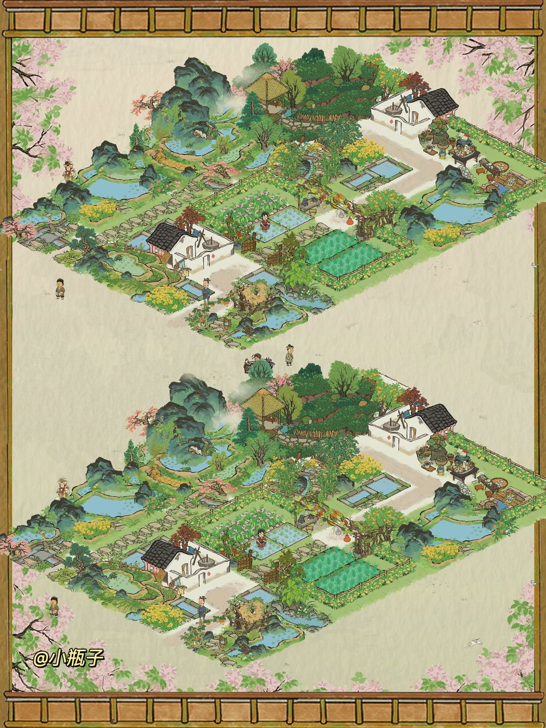 💚图文包含“草稿地布局”及“个人最重敲定”的布局 💚建筑:香粉厂、印刷厂(年历+经书)、溪畔悠悠、四级民宅、五级民宅、碎金泉、芭蕉林、树荫亭、瓜瓜藤蔓、(各种花圃、涵露台、小石山、鸟食台、白茅、棣棠|这些花圃可替换) 💚推荐布局地: 📍城内·暗香边、广陵春、风雅边 📍城外·惊鸿边、烟柳边、白鹤边、春风边、青山边、斜晖边、 ❣️也可以根据自己现有的位置选择布局地 💚环境值:优秀 💚 #江