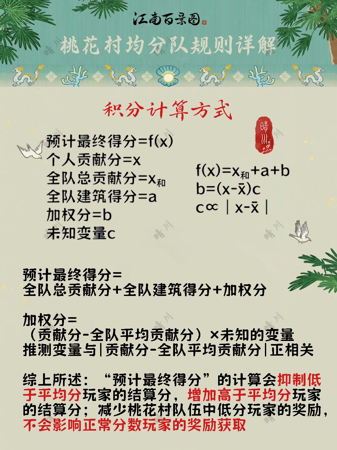 预计最终得分=全队总贡献分+全队建筑得分+加权分 加权分=(贡献分-全队平均贡献分)×未知的变量 推测变量与|贡献分-全队平均贡献分|正相关 综上所述:“预计最终得分”的计算会抑制低于平均分玩家的结算分,增加高于平均分玩家的结算分;减少桃花村队伍中低分玩家的奖励,不会影响正常分数玩家的奖励获取 取三组桃花村均分队数据,不难看出: 高于全队平均贡献分玩家的玩家,预计最终得分也高于全队平均最终得分;反