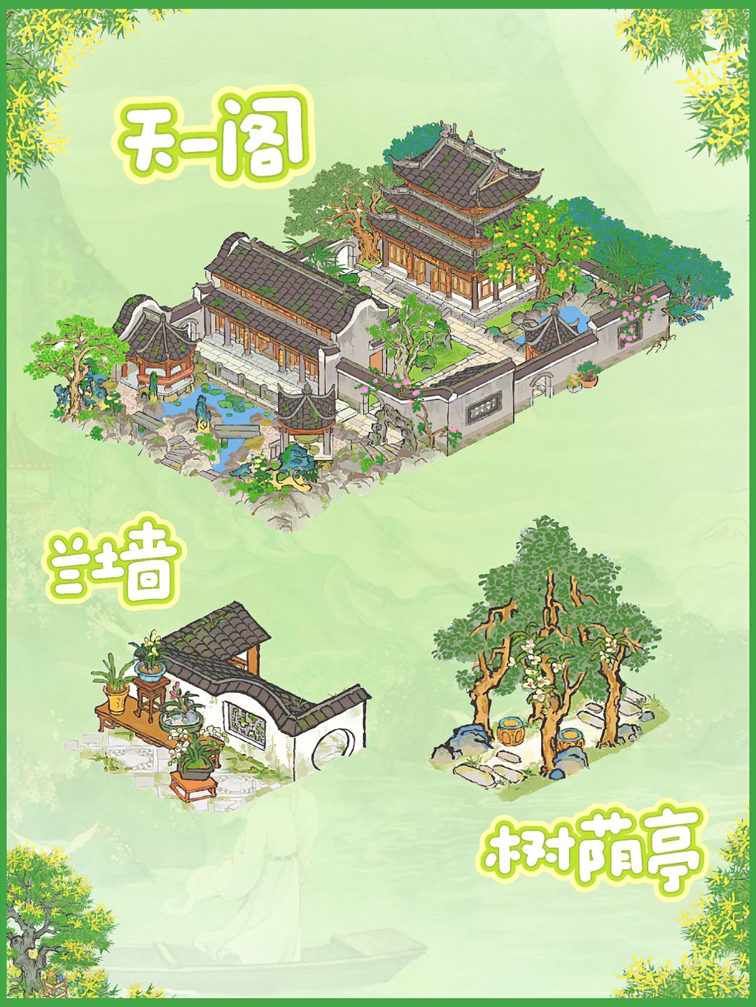 建筑: 兰墙(延伸天一阁另一侧墙壁) 树荫亭(衔接天一阁小石板路的同时,还给天一阁搭配了一棵乘凉树) 远山亭(搭配天一阁自带的小亭子) 旧垣烟树、蕉叶覆梦(天一阁侧门这块属于开放性布局,根据自己现有的建筑放置就可以) 清夏木栾(主要是它的枝叶颜色和天一阁自带的金柑很像,亭亭枇杷稍微有点暗) 草坪(最优选普通草坪,和天一阁的石砖草坪相似) 石狮子(平替丑狮子或者其他) 深山枯藤、独占鳌头、丹青照壁 #