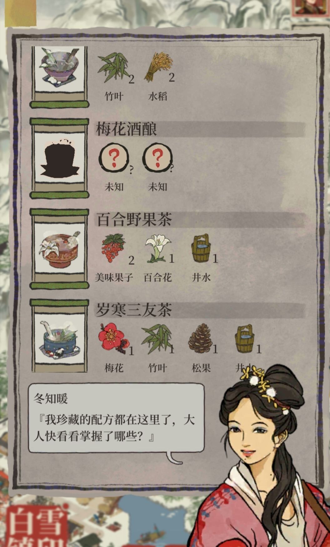 宝箱X5: 钥匙X5: 乱飞红配方: 红色绣球花x5,杜鹃花x5,桃花x5 千山白配方: 白色绣球花x5,山茶花x5,梨花x5,琼花x5,栀子花x5 海棠花饼配方: 路边野果x3,桃花x3,井水x5,面粉x5(面粉在买小鱼干的摊子里获得,10水稻=1面粉)