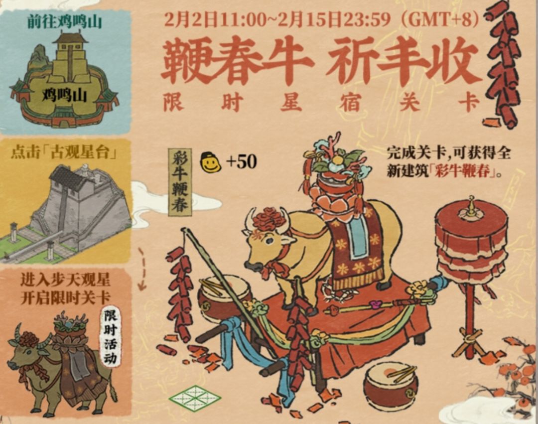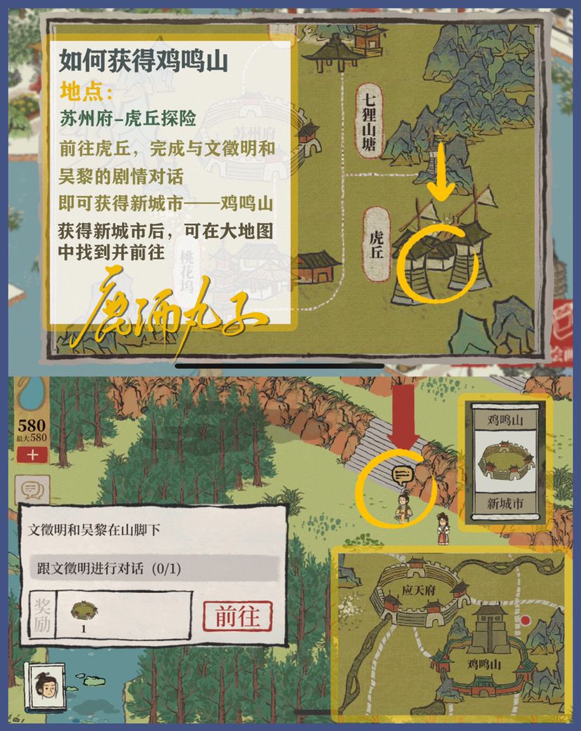 🌿如何获得鸡鸣山 🌸前往虎丘,完成与文徵明和吴黎对话即可获得新城市——鸡鸣山 获得新城市后,可在大地图中找到并前往 🌿如何进入星宿关卡 🌸点击[古观星台],即可进入关卡,进行解锁 🌸本次更新开放角宿关卡——角宿·上 角宿·下 共计11关 🌸每一关分为[主线任务]以及[挑战任务] ⭐️主线任务完成将开启下一关卡 ⭐️挑战任务完成将获得更多星星 ⭐️星星数量将决定观星奖励[当累计到15颗星星后将获得动