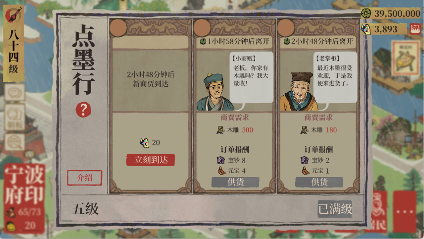 35张地契,100个格子,全部开完了,只等仓库爆仓就可以把制作人手都去做汪笔了。话说汪笔这东西太不赚钱了,第一个卖的,进度是却是最慢的,现在才开了99个格子还差一个#单机游戏