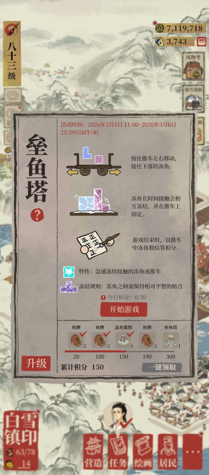 🎉🎉🎉此次5.2.0新春版本的主要更新有:🧊应天府终于迎来了第2次扩建🧊白雪镇也第2次扩建,开启新春新玩法🧊非建造类建筑取消绑定城市,自由布局🧊提升建筑仓库容量和铜钱上限等 📜本篇攻略主要内容围绕的核心是:白雪镇的开地和新玩法。本次活动会比往常要肝一些,但是非限时的。完成垒鱼塔积分活动获得鱼牌,解锁完四种类型的饵料,再完成风物考正册获得奖励即可。有余力的话,尽可能在除夕前把奇观
