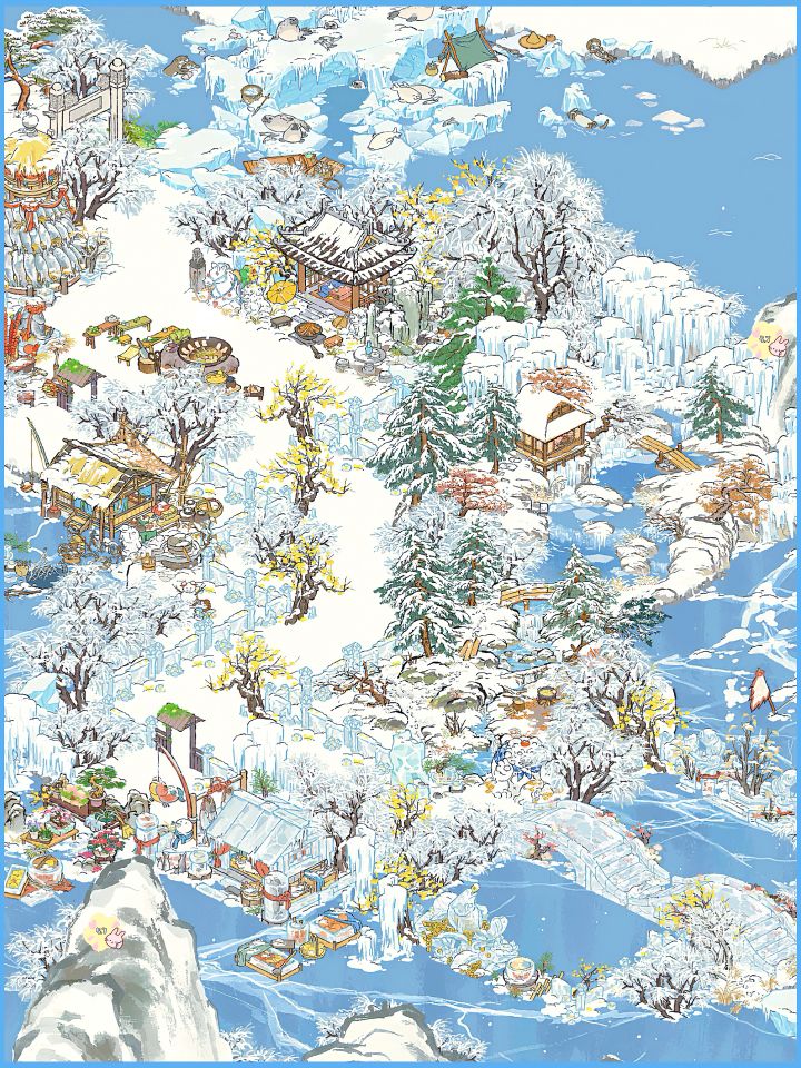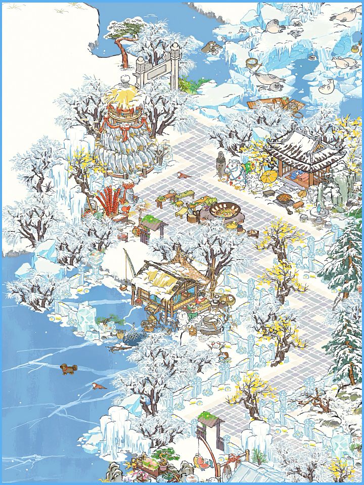 附全图·地基·动图 建筑:松溪营地、储鱼冰屋、雾凇抱枝、雪宠伴松、望雪亭、垒鱼塔、寒雪冰洞、饵料小屋、铁锅炖大鱼、雪满芳园、糖球摊、冰菜缸、储冬菜缸、梅落冰桥、 坐标:白雪镇·嬉雪塘、凝冰塘、登波冰川门 之前发过一个嬉雪塘布局,换了几个小建筑(无关紧要的小建筑,可换可不换)#江南百景图 #江南百景图白雪镇 #游戏日常 #江南百景