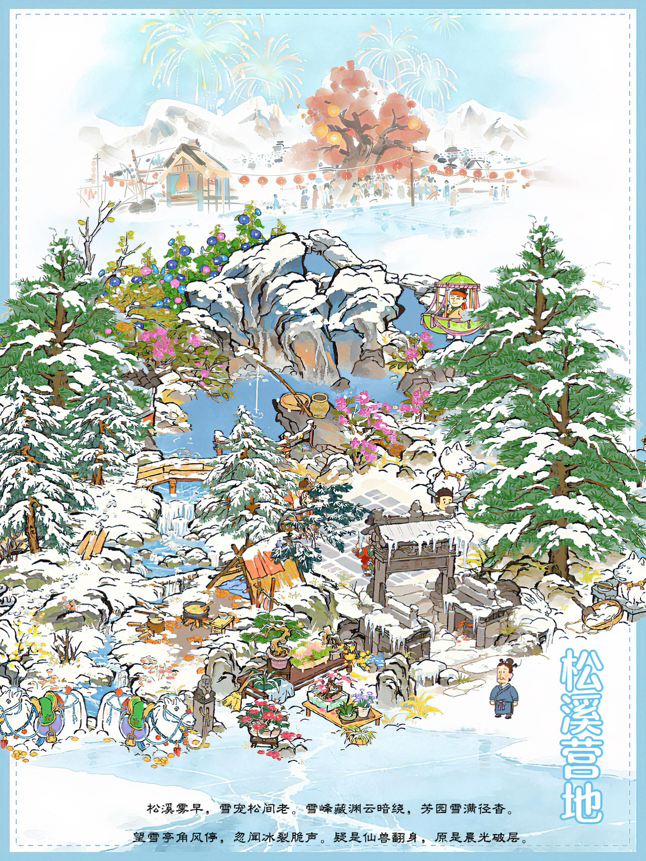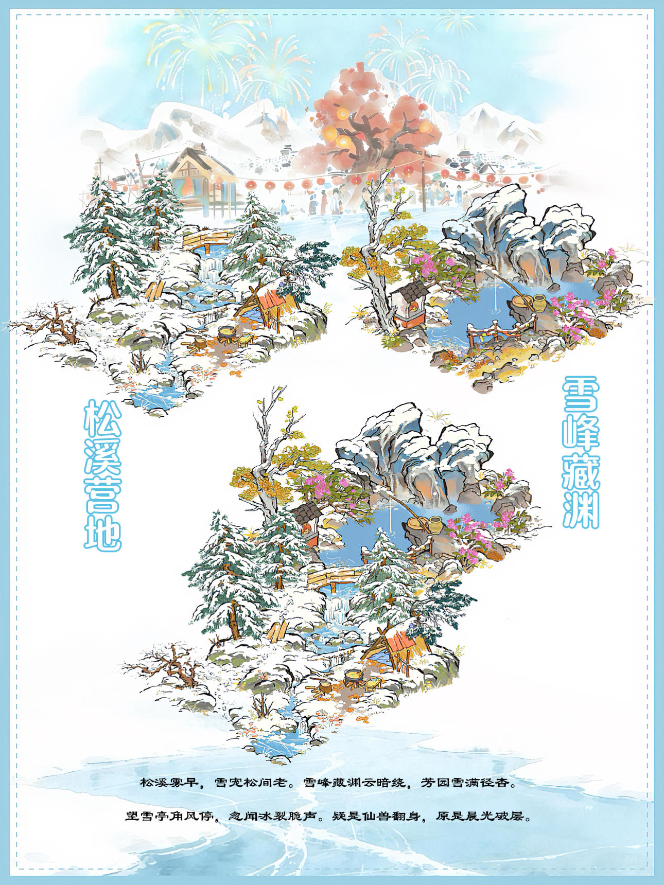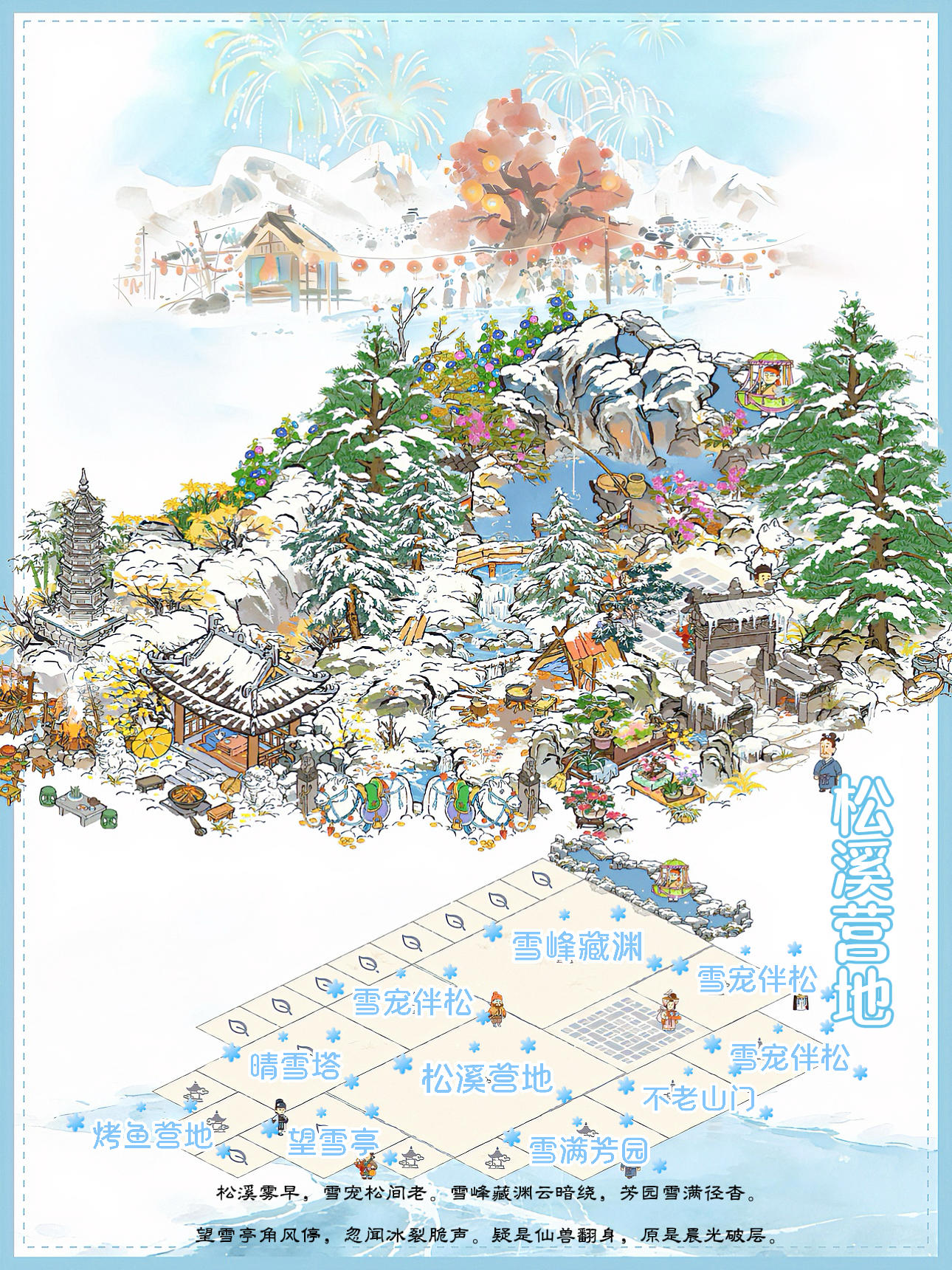 建筑:松溪营地、雪峰藏渊、雪满芳园、望雪亭、雪宠伴松、晴雪塔、不老山门框框来自@知府饼饼#江南百景图 #江南百景图布局 #古风游戏 #游戏日常 #发现好游戏 #江南百景图白雪镇