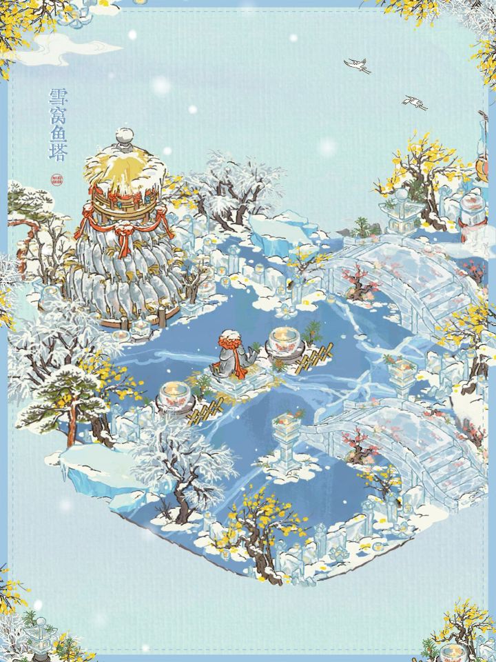 开屏壁纸预示着这个被钓鱼🎣支配的冬天【1】浅水(3~5米)钓出宝箱🧊的概率比钓出珍稀鱼类(如玳瑁🐢)的概率还高【2】渔具升级先鱼线再钓竿(不同品种的鱼分布在不同深度,钓出新品种奖励冻梨🍐)【3】7款钓竿(已出4款):普通、竹制(加失误次数)、守拙(不操作时水位不下降)、延波(奖励区加长、个人最爱)【4】闲着没事多钓鱼,雪渔图鉴153点进度 =49种鱼×3(首次、数量、重量成就)+6只祥瑞