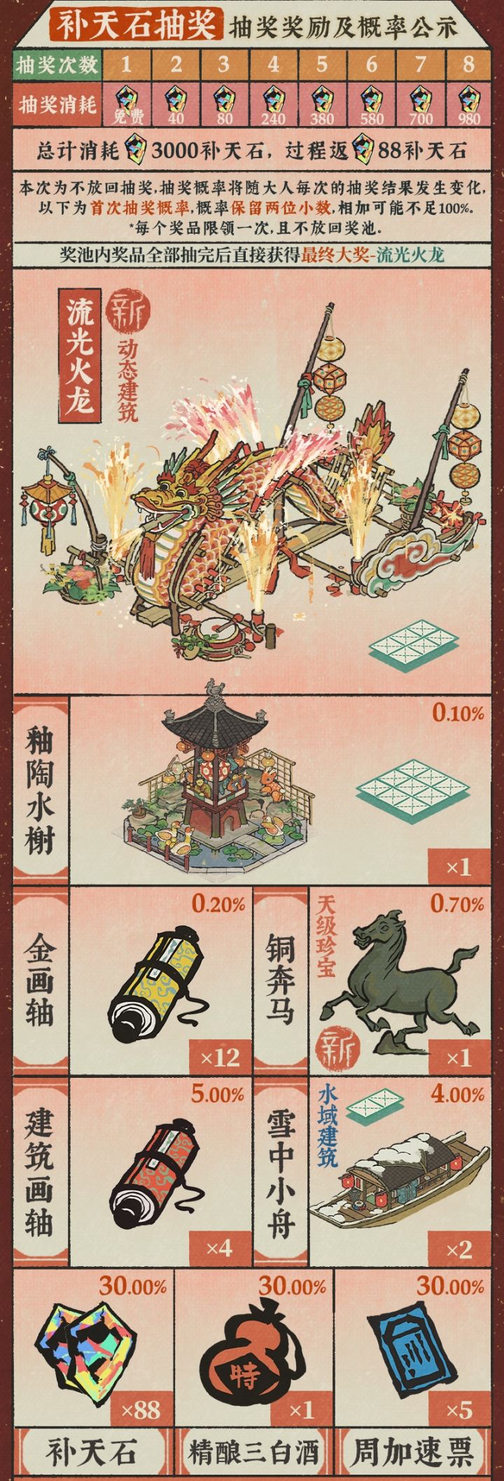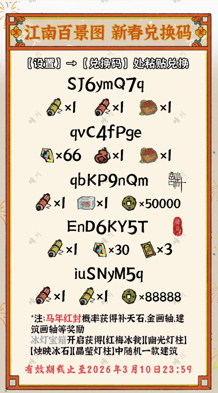 SJ6ymQ7q金画轴*1、建筑画轴*1、马年红封*1qvC4fPge补天石*66、精酿三白酒*1、马年红封*1qbKP9nQm建筑画轴*1、冰灯宝箱*1、铜钱*50000EnD6KY5T金画轴*1、补天石*30、无限加速票*3iuSNyM5q金画轴*1、建筑画轴*1、铜钱*88888持续更新……