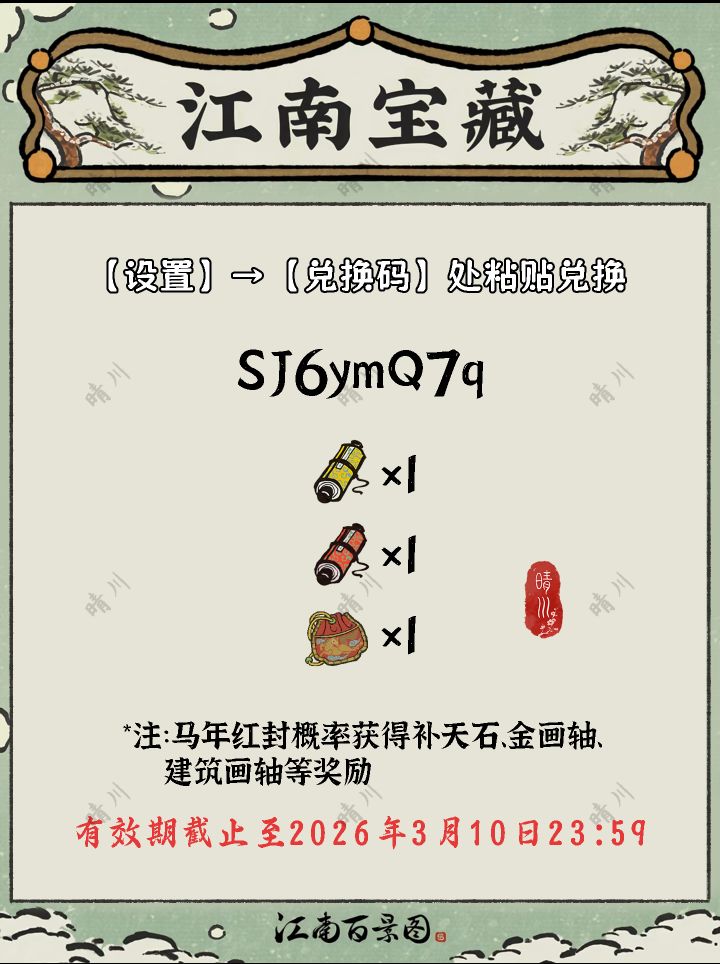 SJ6ymQ7q金画轴*1、建筑画轴*1、马年红封*1持续更新……【设置】→【兑换码】处粘贴兑换兑换间隔10min有效期截止至2026年3月10日23:59#江南百景图 #江南百景图兑换码