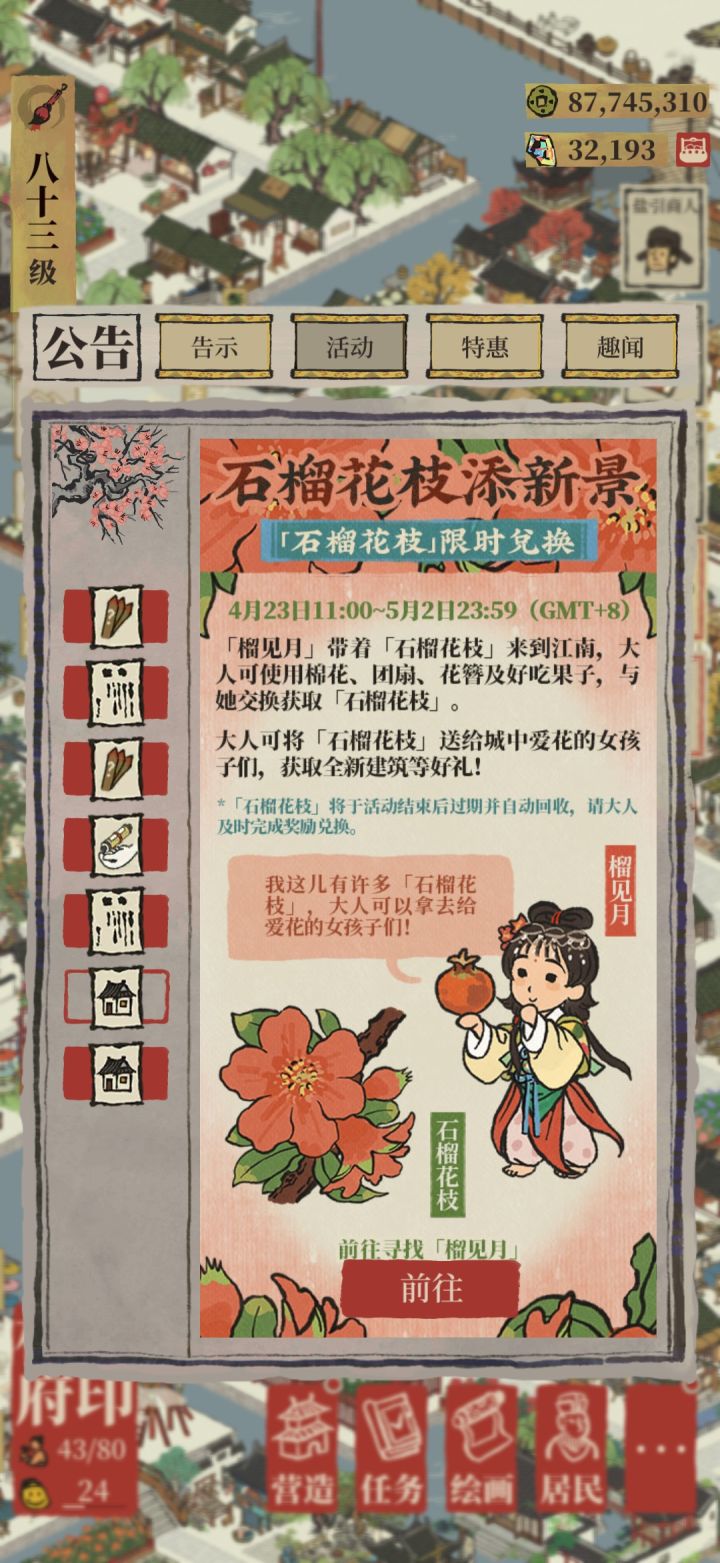 ①「石榴花枝🌺」是什么?4.23-5.2活动兑换代币,每日获取上限16个②「好吃果子🍊」是什么?本次活动的难点,唯一获取地点:应天驿站-丽娘府宅-早餐摊百合花🌷*5+水稻🌾*3=好吃果子🍊*1③如何高效采集「水稻🌾」?丽娘府宅仅1块「水稻田」,刷新慢,不推荐杭州驿站-旧事小蛮有3块「水稻田」,强推!④为期10天的兑换是否需要「全勤✍🏻」?⚠️本次活动有三个独立的奖励兑换界面兑