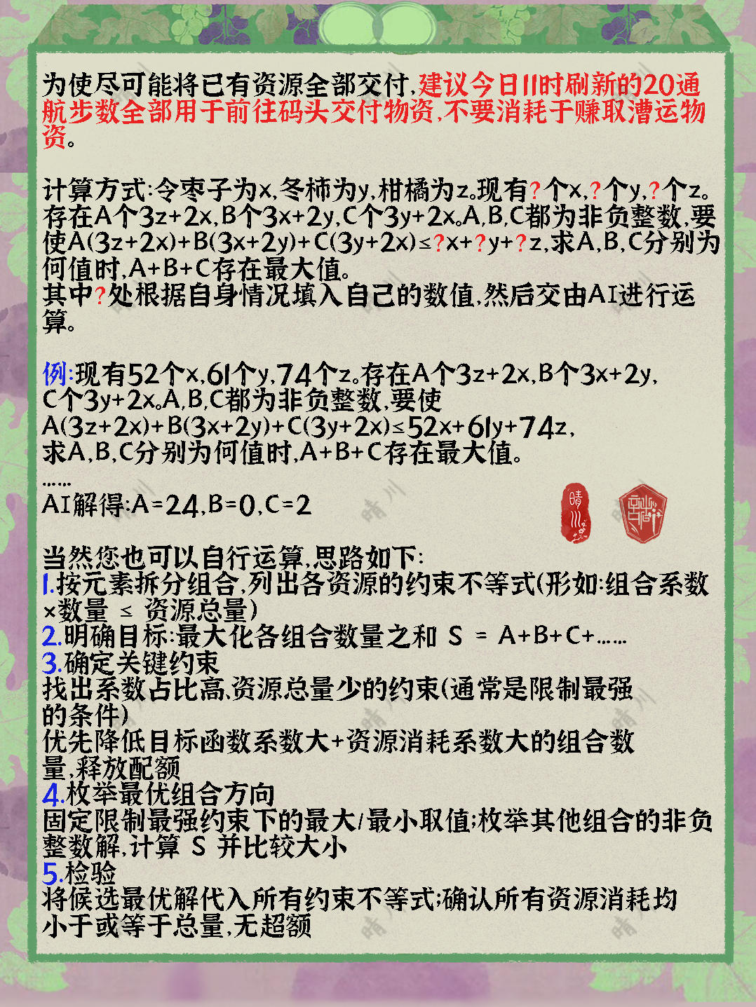温馨提示:今日(2025.12.18)为本期限时漕运活动最后一天,结束后未使用的漕运物资,通航步数将过期。今日码头所需资源:A 3柑橘 2枣子B 3枣子 2冬柿C 3冬柿 2枣子为使尽可能将已有资源全部交付,建议今日11时刷新的20通航步数全部用于前往码头交付物资,不要消耗于赚取漕运物资。计算方式:令枣子为x,冬柿为y,柑橘为z。现有?个x,?个y,?个z。存在A个3z+2x,B个
