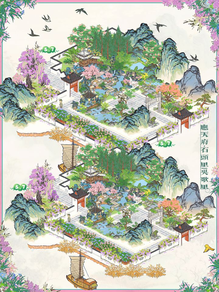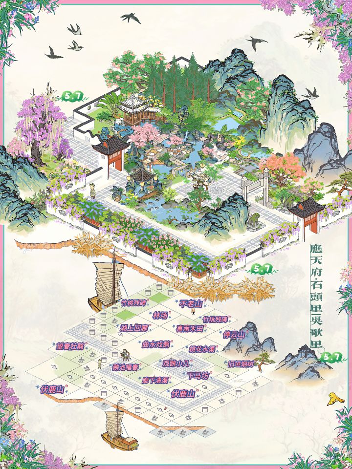 建筑:望春杜鹃、湖上回廊、曲水戏鹅、鹅池唱春、林场、喜雨禾田、不老山、桃花水渠、竹林残碑、停云山、观鹅小凡、旧垣烟树、廊下清渠、下马坊、伏鹿山#江南百景图 #模拟经营游戏 #古风游戏 #好玩的模拟经营游戏 #江南百景图应天府布局