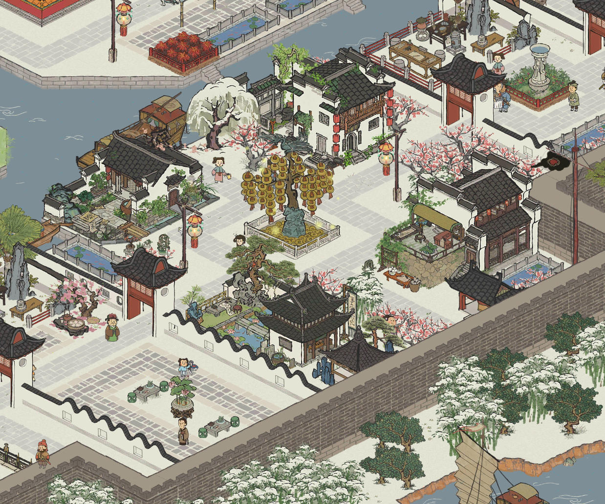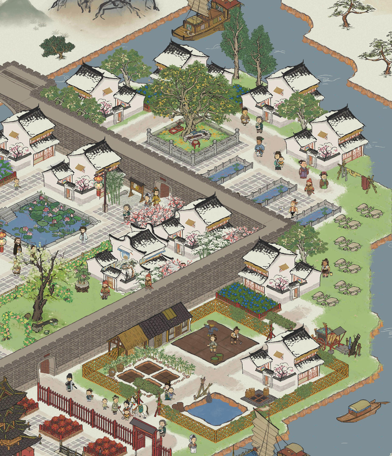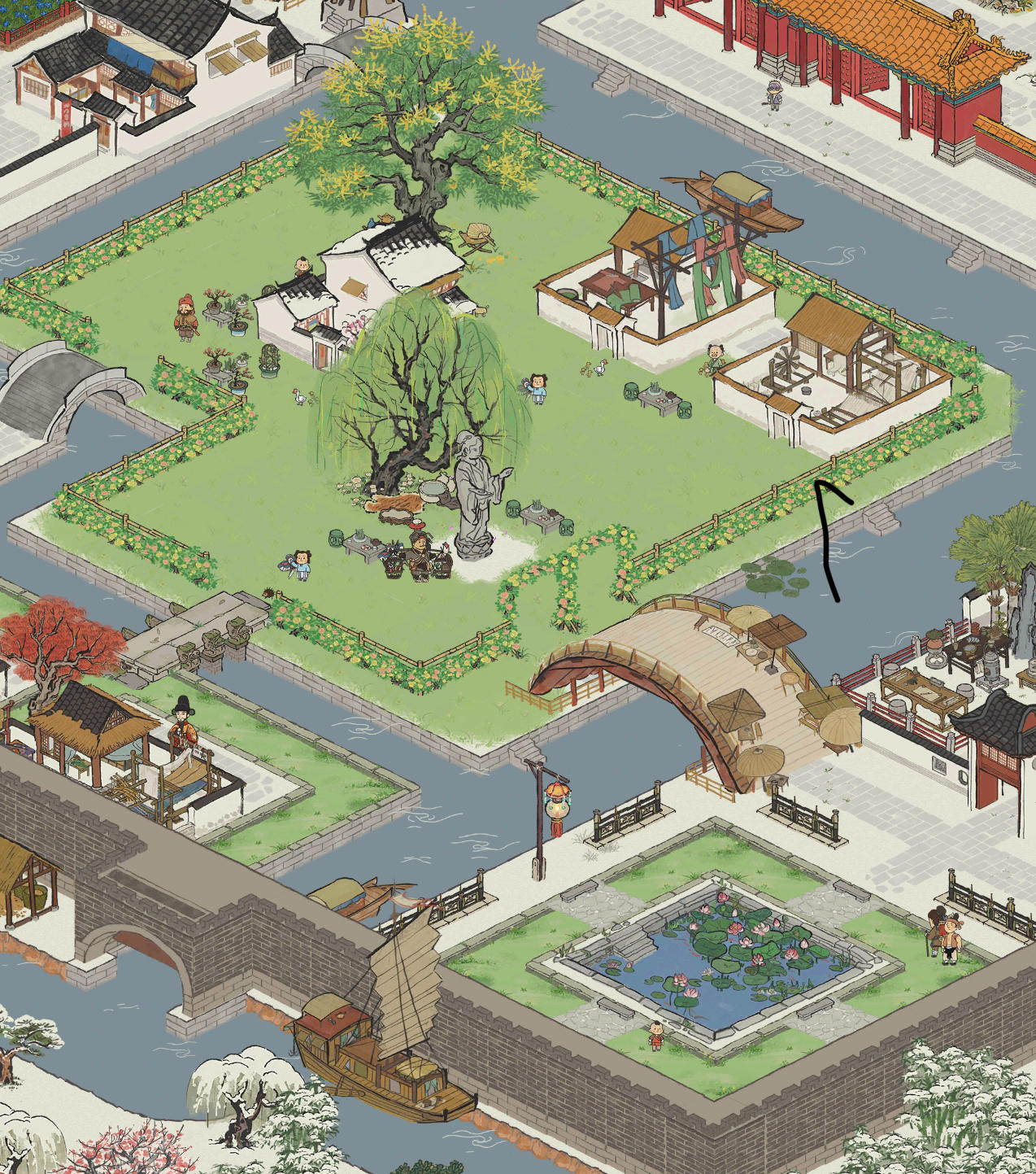 建筑:喜雨禾田、放鸢台、古柳迎春、仲夏悠居、清风亭、桃花水渠、春日踏青、义庄、语莺花市、临溪亭、璧泉垂秀、石桥花荫、月老祠、驿站、盆景园、风雅琴院、聚流亭、颜如玉、游凤画舫、水上戏台、甜品铺子生产建筑:铜矿、铜镜厂、养鸭场、餐馆、琥珀酒坊、锦绣饰坊、珍馐食肆、棉花田坐标:绍兴府·离索桥|春秋桥|运塘桥|同舟桥|渡人桥|惊鸿桥|倚斜桥|浣纱桥·全激活#
