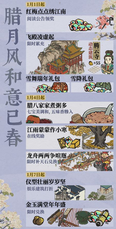 1月1日- 【红梅点点绣江南】阅读公告即可立即领取补天石好礼。1月1日-1月7日-【飞殿凌虚起】限时累充活动开启!累计充值一定数额补天石即可获取全新动态建筑【腾云寺】等丰富奖励。-【雪舞瑞年礼包】【雪降礼包】开启购买。1月4日-1月6日- 【江雨蒙蒙作小寒】在线奖励活动开启!累计游戏在线时间即可获取【百年银杏】、补天石等奖励。1月4日-1月10日- 【腊八家家煮粥多】活动开启!