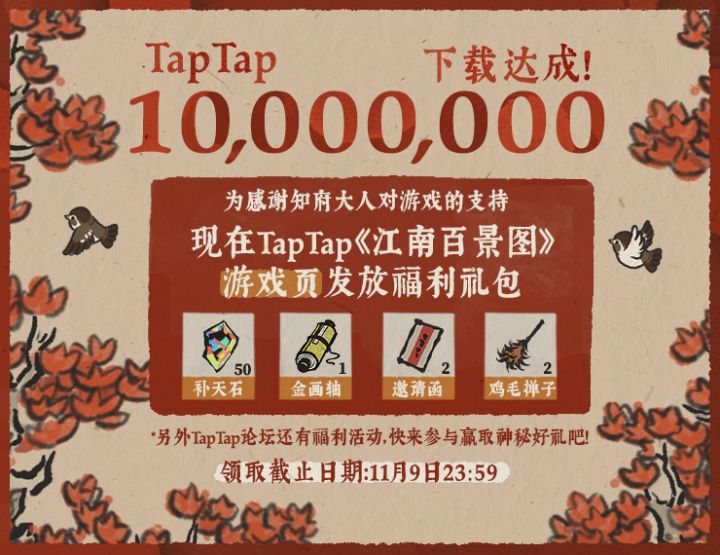 ——齐聚江南,感恩有你——《江南百景图》TapTap 10,000,000 下载达成!为感谢知府大人们的支持,丽娘在《江南百景图》游戏详情页发放福利兑换码,知府大人们可前去领取,领取截止日期:2020年11月9日23:59。另外,TapTap论坛稍后还会有福利活动,请期待后续发布的活动消息哦~