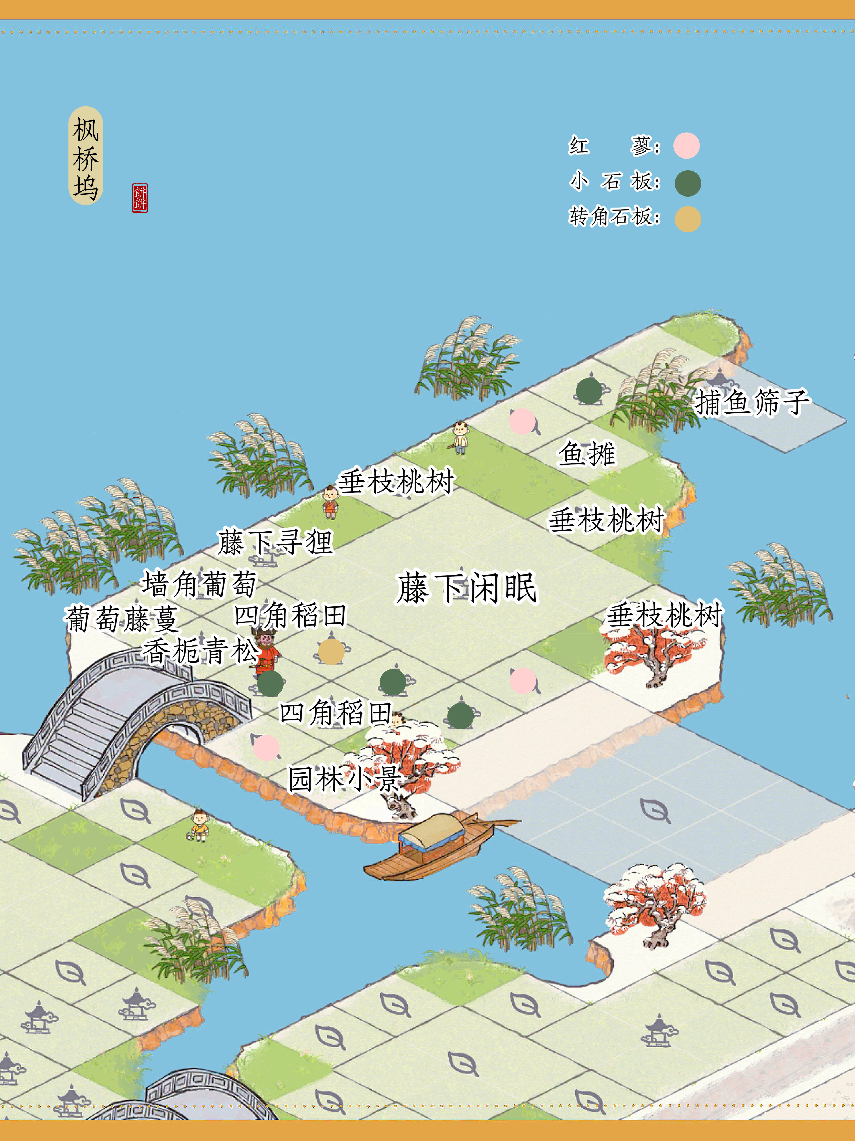 标注的地基名字有:谷雨茶家、烟雨熟青梅,烟雨枕水道、廊下清渠、客舍茶摊、豆梨开雪、溪畔悠悠、枫落棋盘、鸣琴春晓、桃花水渠。图上烟雨熟青梅,不小心标错了#江南百景图 #江南百景图扬州府 #江南百景图布局