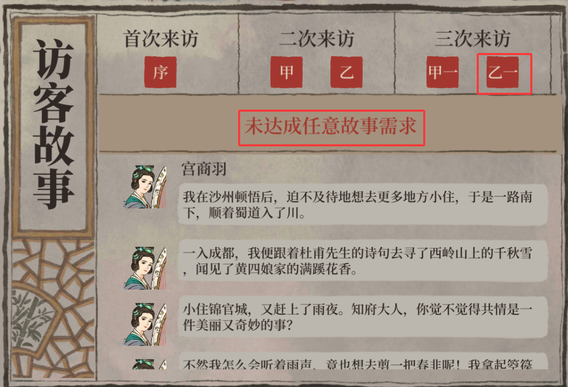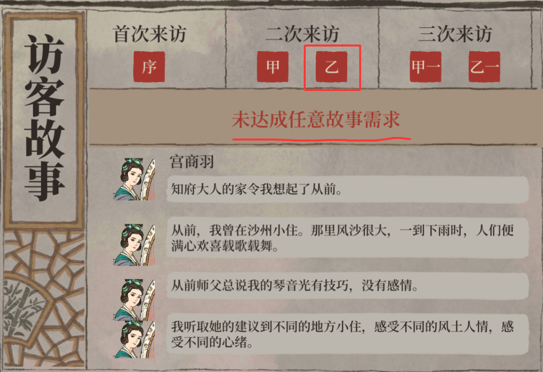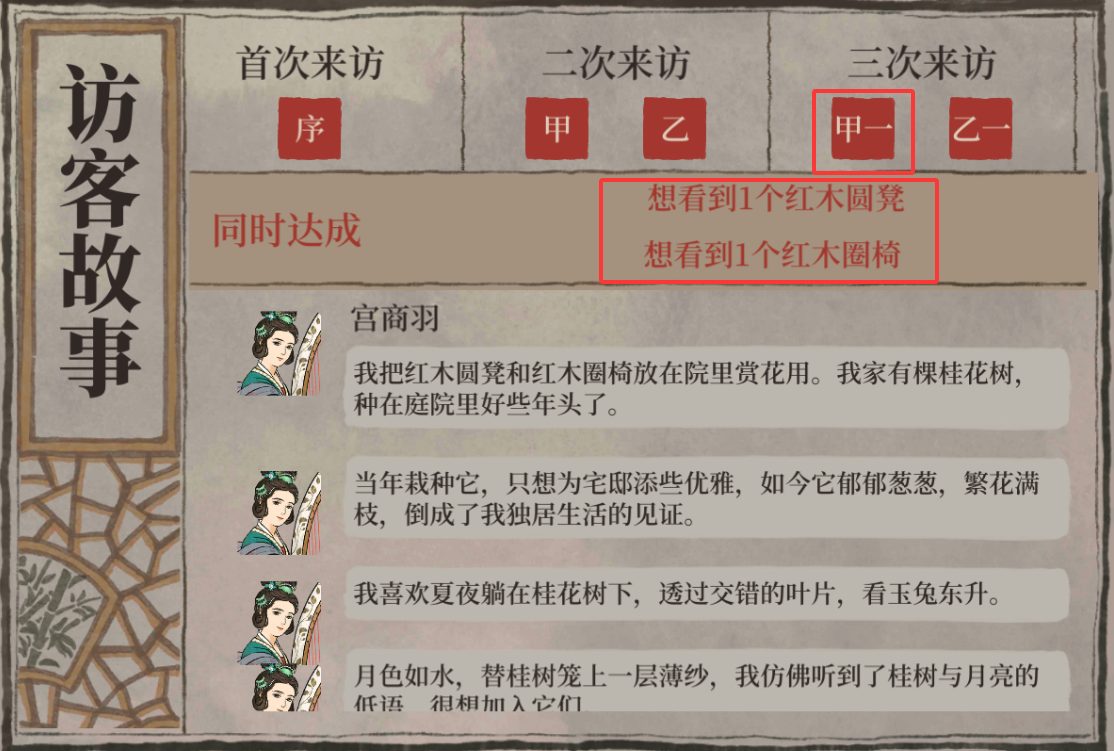 达成条件要求达成甲:喜欢优雅而美观的二楼房间,对应乙:未达成任意故事要求,甲达成后刷新同样的条件所有要求未满足,那么就会完成乙条件。