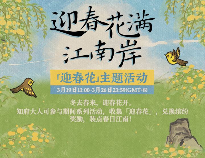 3月19日至3月26日,前往#江南百景图 限时收集「迎春花」,免费兑换多重春日好礼,开启江南明媚花季!⭐限时收集「迎春花」⭐3月19日至3月26日,前往「金陵客栈」完成食客订单,可收获随香料掉落的「迎春花」;前往对应活动页面,每日可使用菜肴、成衣兑换「迎春花」。⭐「迎春花」奖励兑换⭐3月19日至3月26日,使用所收集的「迎春花」,可免费兑换「花衣宝盒」、「迎春小景」、「小石板」等奖励。*「