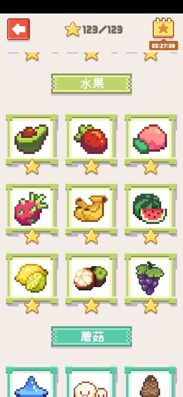 通关纪念。总的来说还是很简单的。感觉很多关卡的谜底都不是唯一解,拼图所需的积木块数越多答案就越容易不唯一。甚至有一关给了两种积木,我只用了其中一种就过关了,另一个根本没用上。水果那一章过于简单了。蘑菇最后几个还算有点难度。