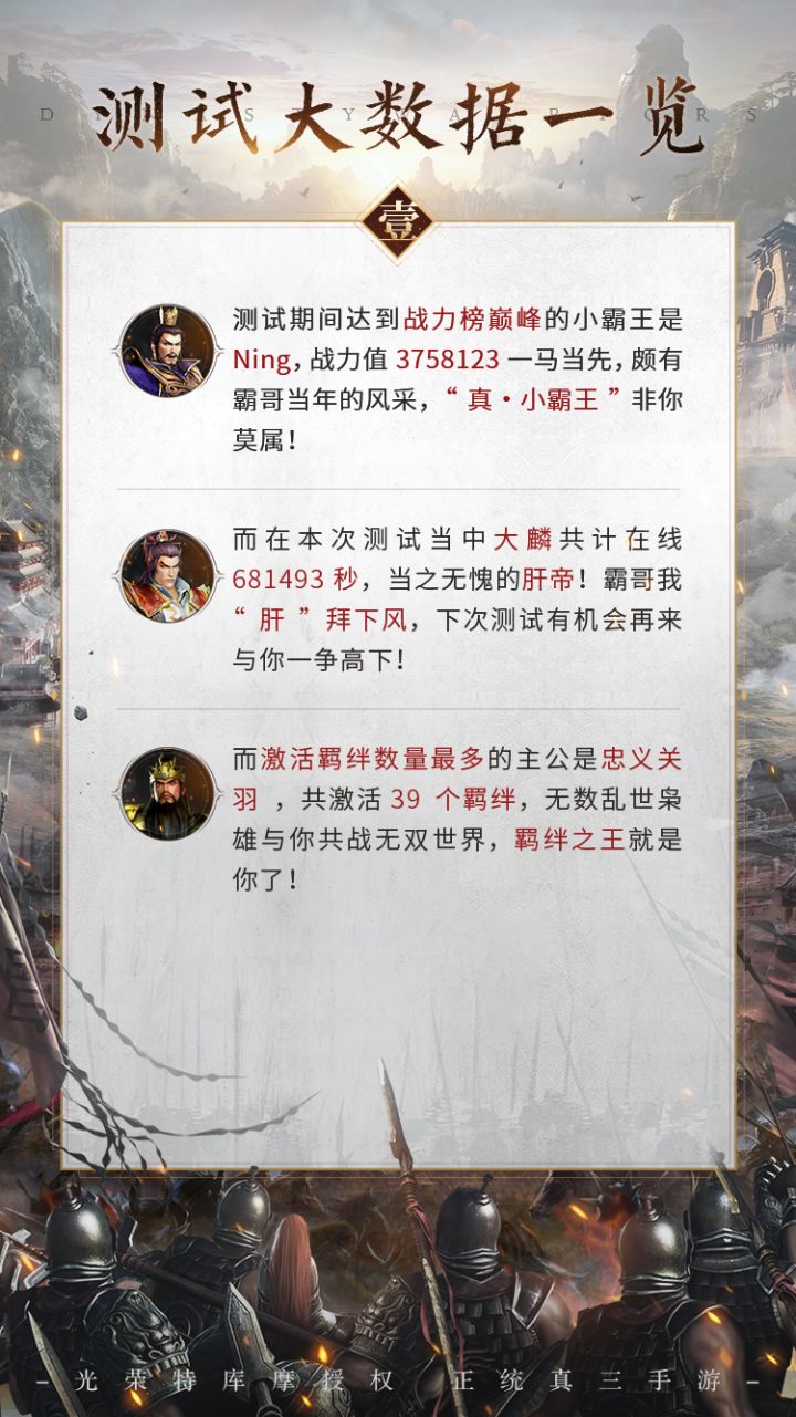 Hello各位小霸王们“将星测”已正式于12.1(昨天)结束关服,虽说有万千不舍,但是请期待开发组的测试调优及后续的消息叭~,感谢大家对《真・三国无双 霸》的陪伴与支持!测试期间真是遇到了不少超级强的小霸王呢~打得超级过瘾!现在让我们来一起回顾“将星测”数据里程碑!“将星测”霸王之最“将星测”武将之最“将星测”趣味数据之最“将星测”榜单之星好了本次回顾就到这里感谢大家对我们的